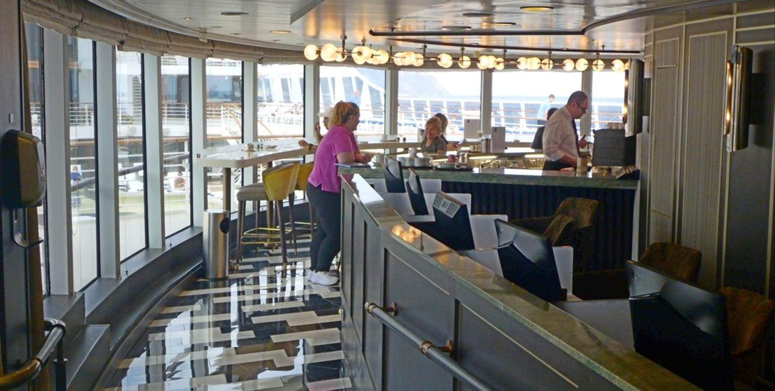 Baristas As the name suggests, this is a coffee bar with made to order specialty drinks. We found that ordering an Americno coffee with two shots of espresso (instead of the normal one) produced just the kind of coffee we like. They also have a selection of cookies, small cupcakes, and other munchies. Because of the relatively cold weather on most of this cruise, combined with the need to be outside to watch the passing landscape, Baristas was very busy, often a bit hectic, but the staff always managed to provide good service with a smile. We visited Baristas at least once a day almost every day for either a “double shot Americano” or some hot tea.