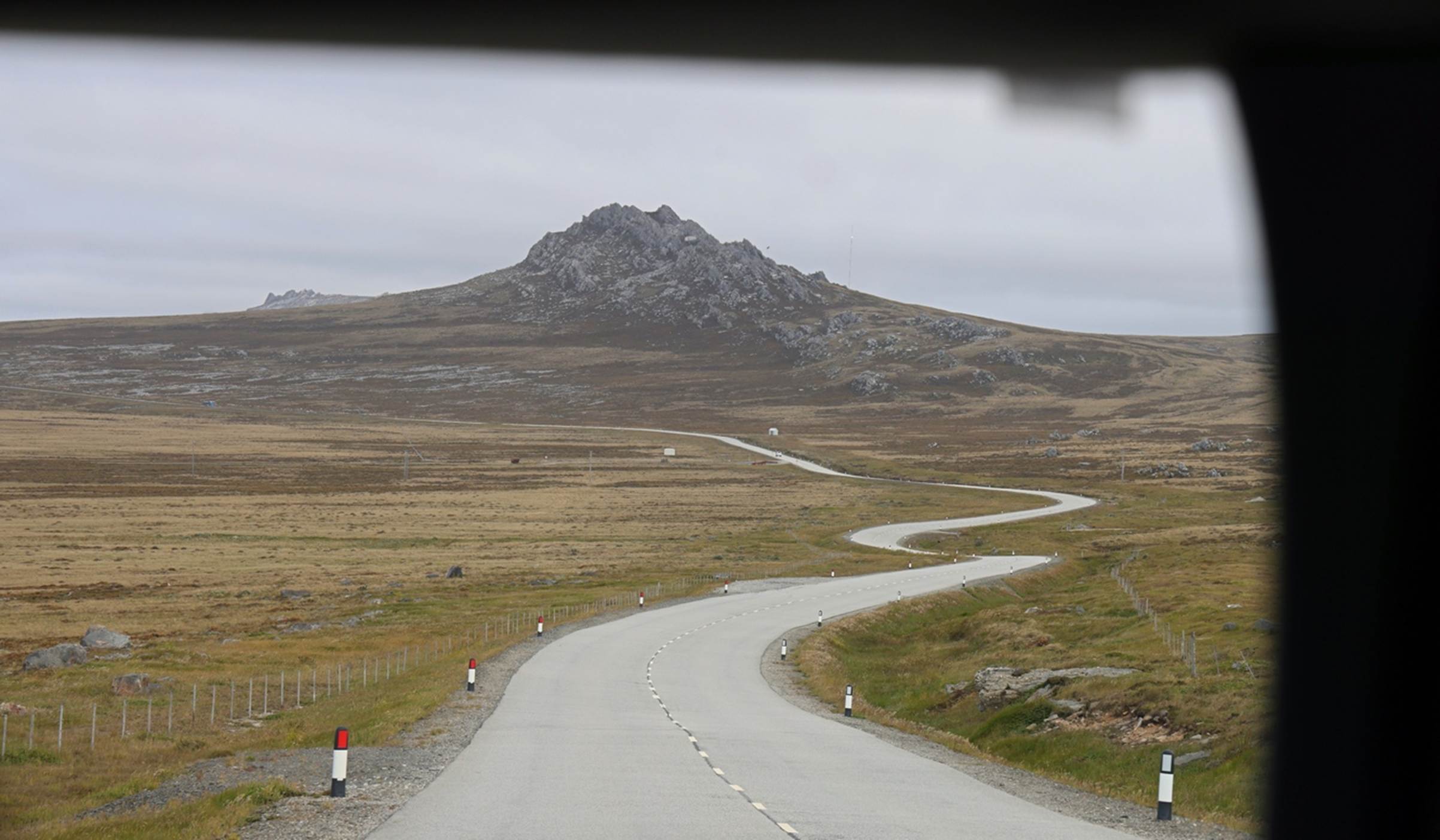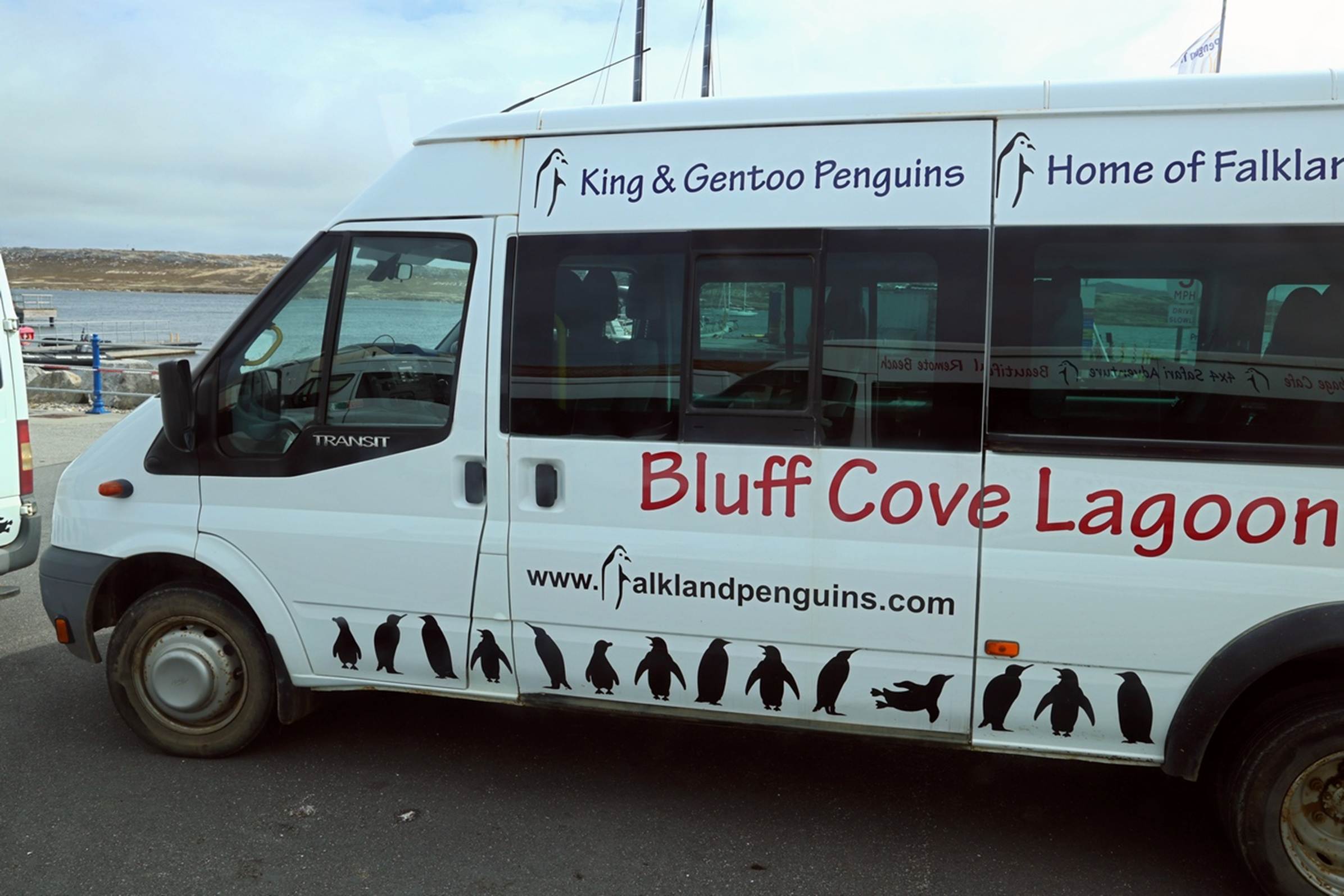 We had scheduled an excursion to see some penguins: our group was called soon and we boarded the tender for the ride to the dock. When we unloaded at the dock, there were several vans waiting for us and the signs on the side of the vans made it clear what we would be doing. We were in the Falkland Islands to go to Bluff Cove to see Gentoo and King Penguins.