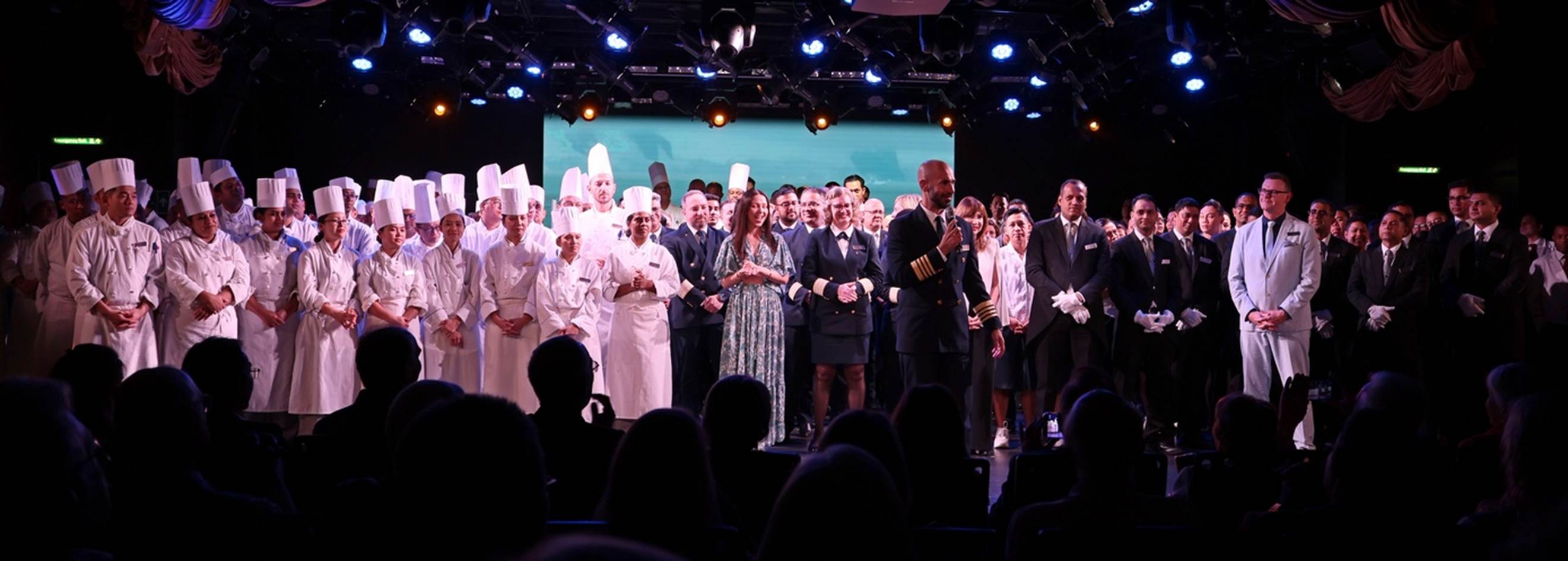 The main entertainment tonight was a show by the production company (singers, dancers, band) titled “Our World” featuring songs from around the world. Most of the songs were recognizable and easy to listen to and watch, so very enjoyable. After the show the captain brought a large number of the staff & crew onto the stage to be recognized and to take a bow.