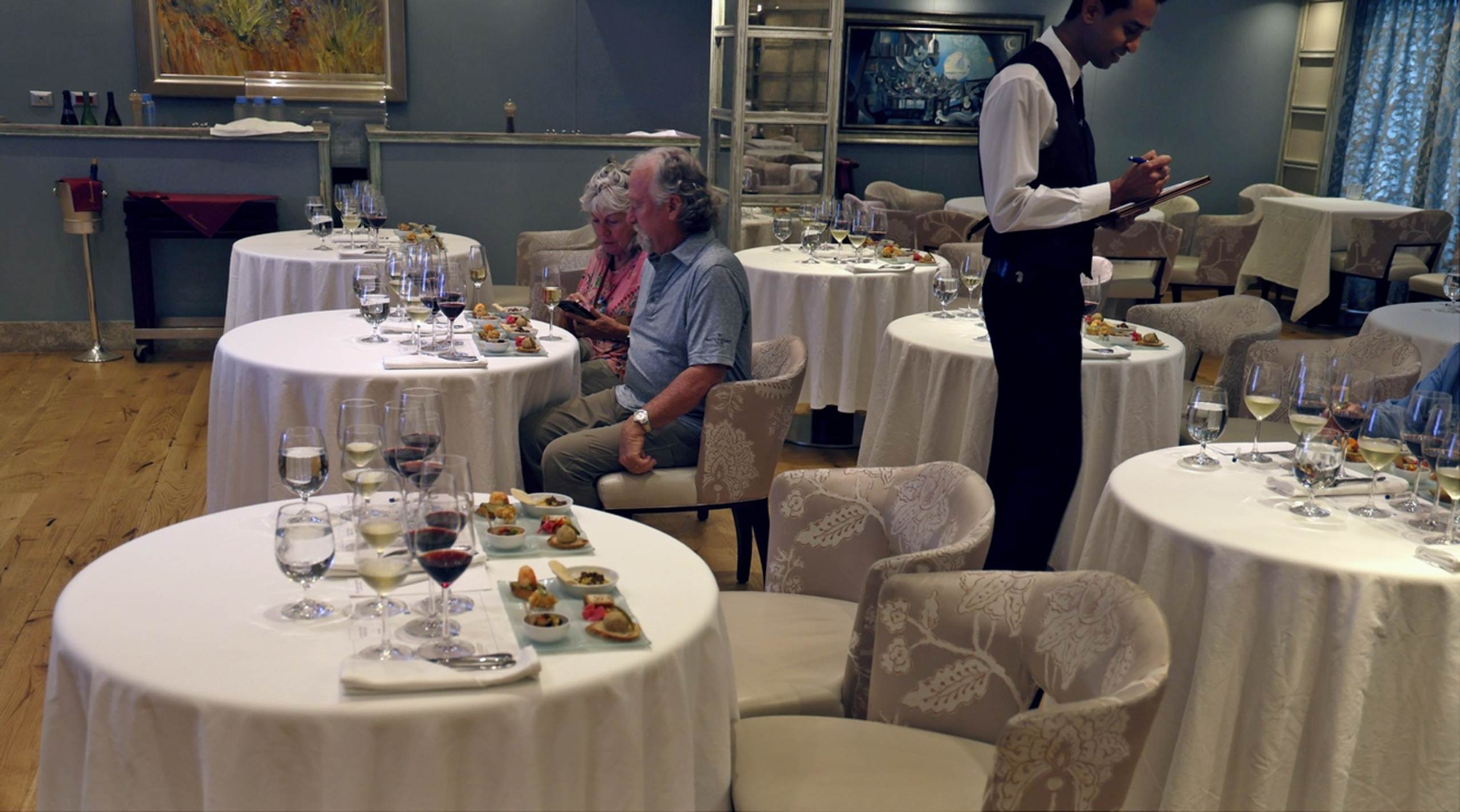 Our last full day on board the Marina was another day at sea. As usual for “at sea” days, there were many activities planned around the ship, with card games, dancing, cooking demonstrations, an enrichment presentation, and, most important for us, a final wine tasting. But first, we did attend the final presentation, this one about the patterns of the many hot and cold cycles on the earth in its lifetime. After lunch we headed for the wine tasting: this time the focus of the tasting was on pairing wine with foods.