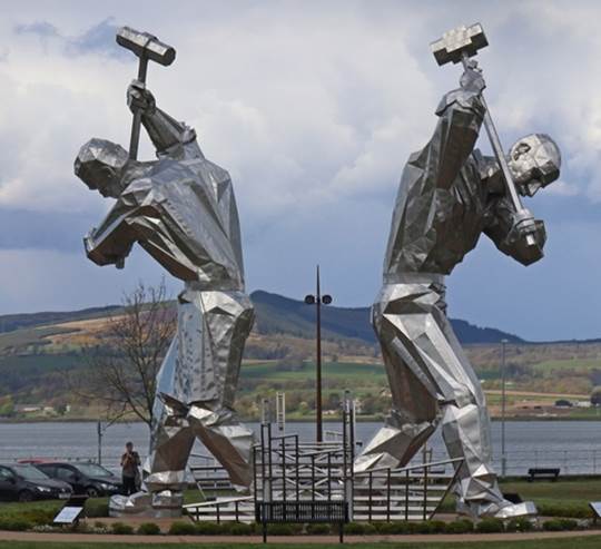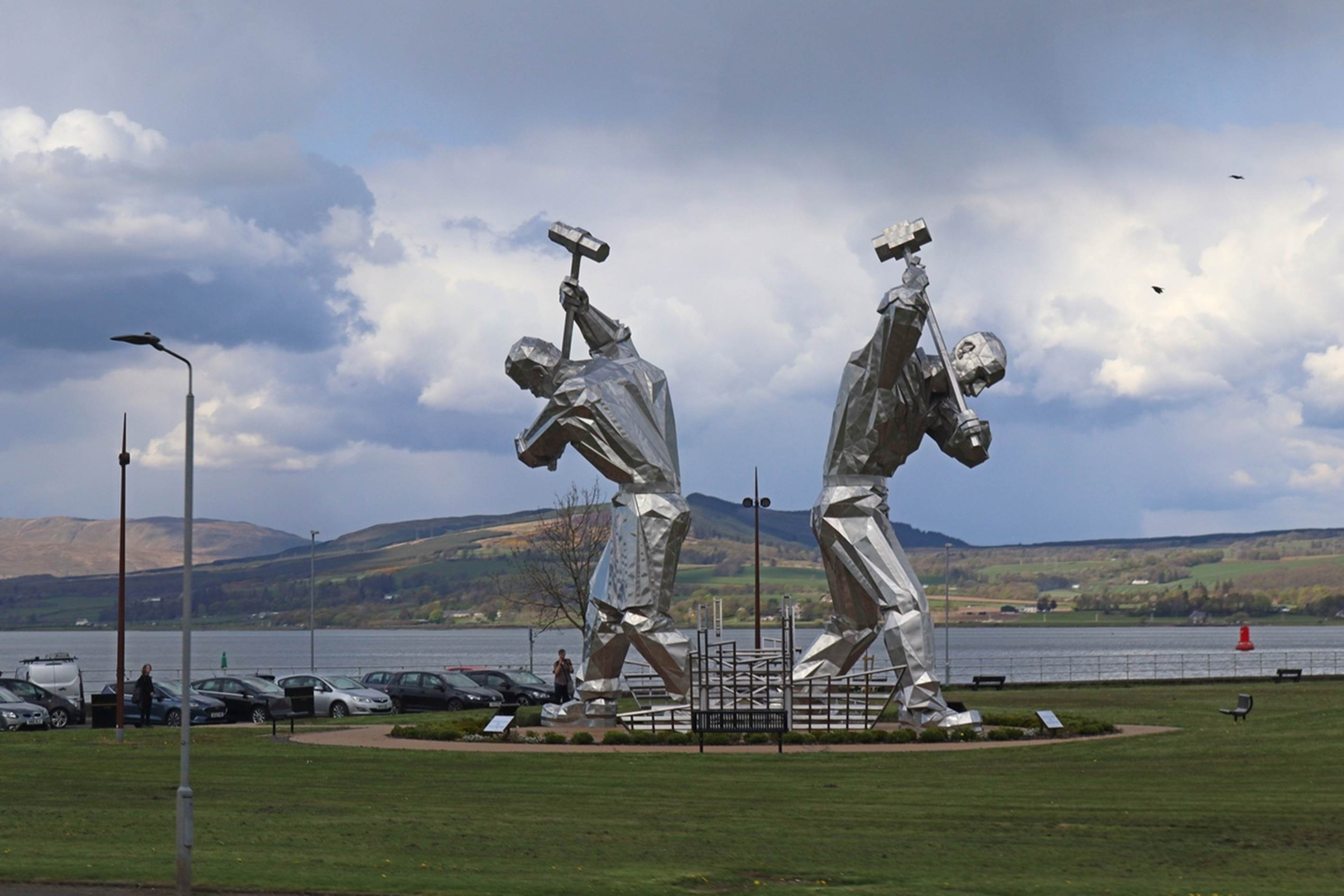 As we got closer to Greenock, the port city for Glasgow, we passed Dumbarton castle on the opposite bank of the river Clyde from our highway. We also passed by a rather striking memorial to the many people who had been the shipbuilders at the port of Glasgow in the past.