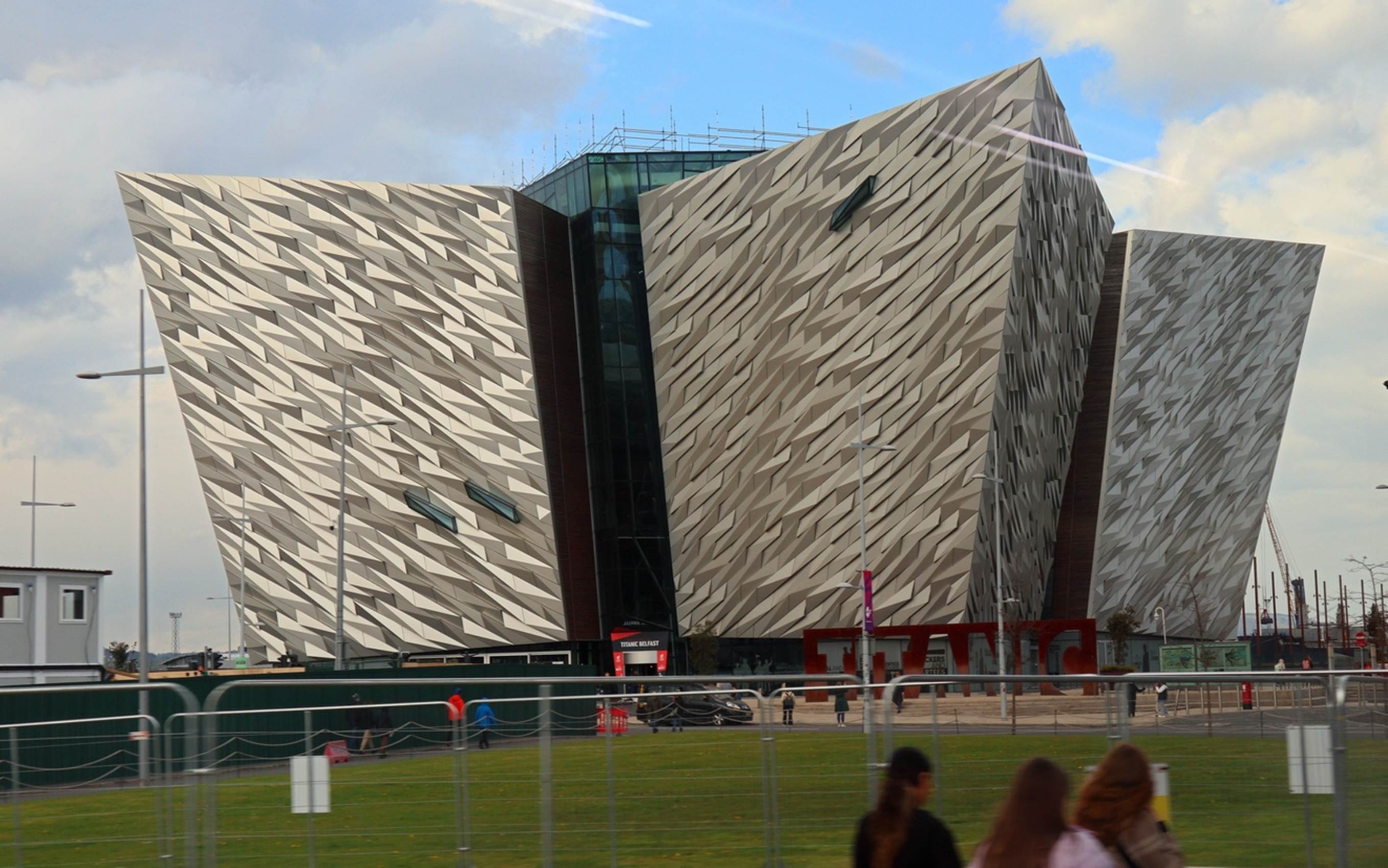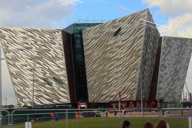 We left the Peace Walls and headed into the harbor area for one more sight before getting back to Sirena. The Titanic was built in the Belfast and the local tourist trade tends to make much of that fact. A new attraction in the harbor is the “Titanic Experience”. We did not have time to tour the facility, but all reports I saw suggested it is a very interesting and immersive experience. Our bus drove to the Titanic Experience building and more or less circled the building for us to take a good look. The shape of the building seemed rather strange until it was explained to us. The four sides of the building have triangular extensions jutting out from the central core. These extensions are supposed to be the same shape and size as the bow of the Titanic. I cannot verify that is accurate, but if so, the Titanic was definitely a large, dare I say “titanic”?, ship.