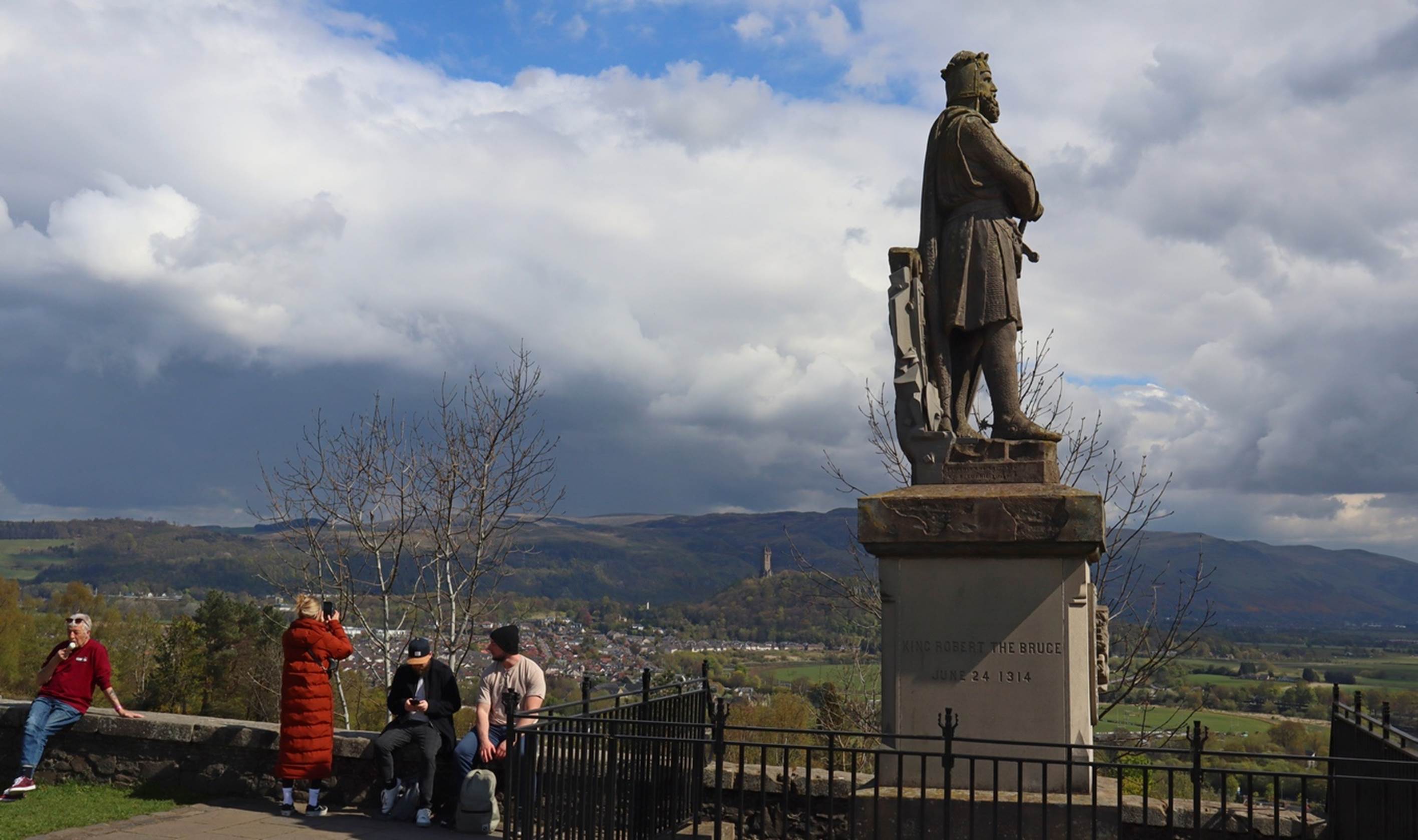 Statue of Robert the Bruce with Wallace memorial in the distance.