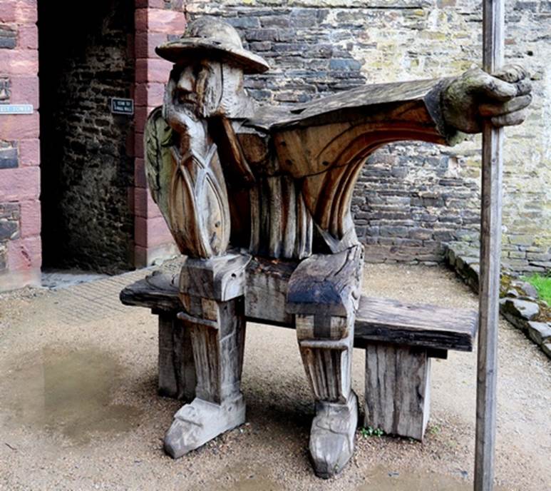 We entered the castle and had a brief tour of some of the main points of the fortress. One of the first things we encountered was the wooden statue of a seated “knight” that you can see at the very top-right of this page. Inside the walls some of the area used to be an open courtyard and are mostly covered with green grass now while the rooms that were roofed over are now also open because the wood timbers supporting the roof rotted away long ago.