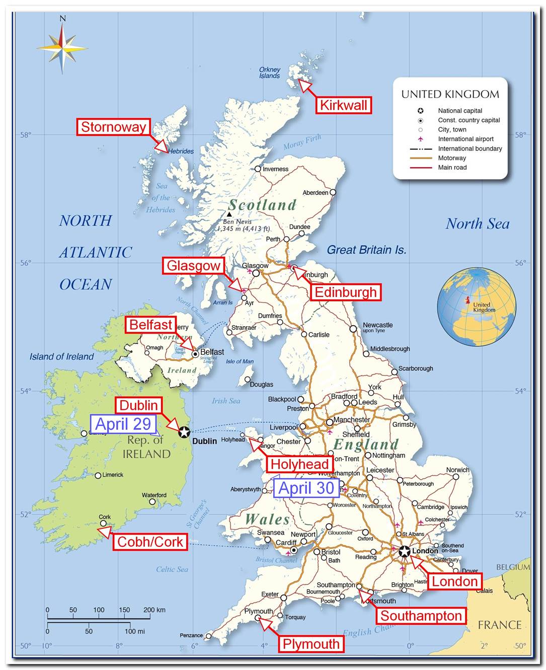 We are heading a little further south and leaving behind the scenic seashores and chilly winds for the warmer climate of the Republic of Ireland and Wales. This will involve pubs and castles…. Lots of pubs and lots of castles. But, before we left the ship, I had a task. I still had a rather sore throat and definitely did not feel 100% so I thought it a good idea to use one of the COVID self-test kits we had brought with us. Thankfully, it was negative: otherwise this would be a very uninteresting day.
