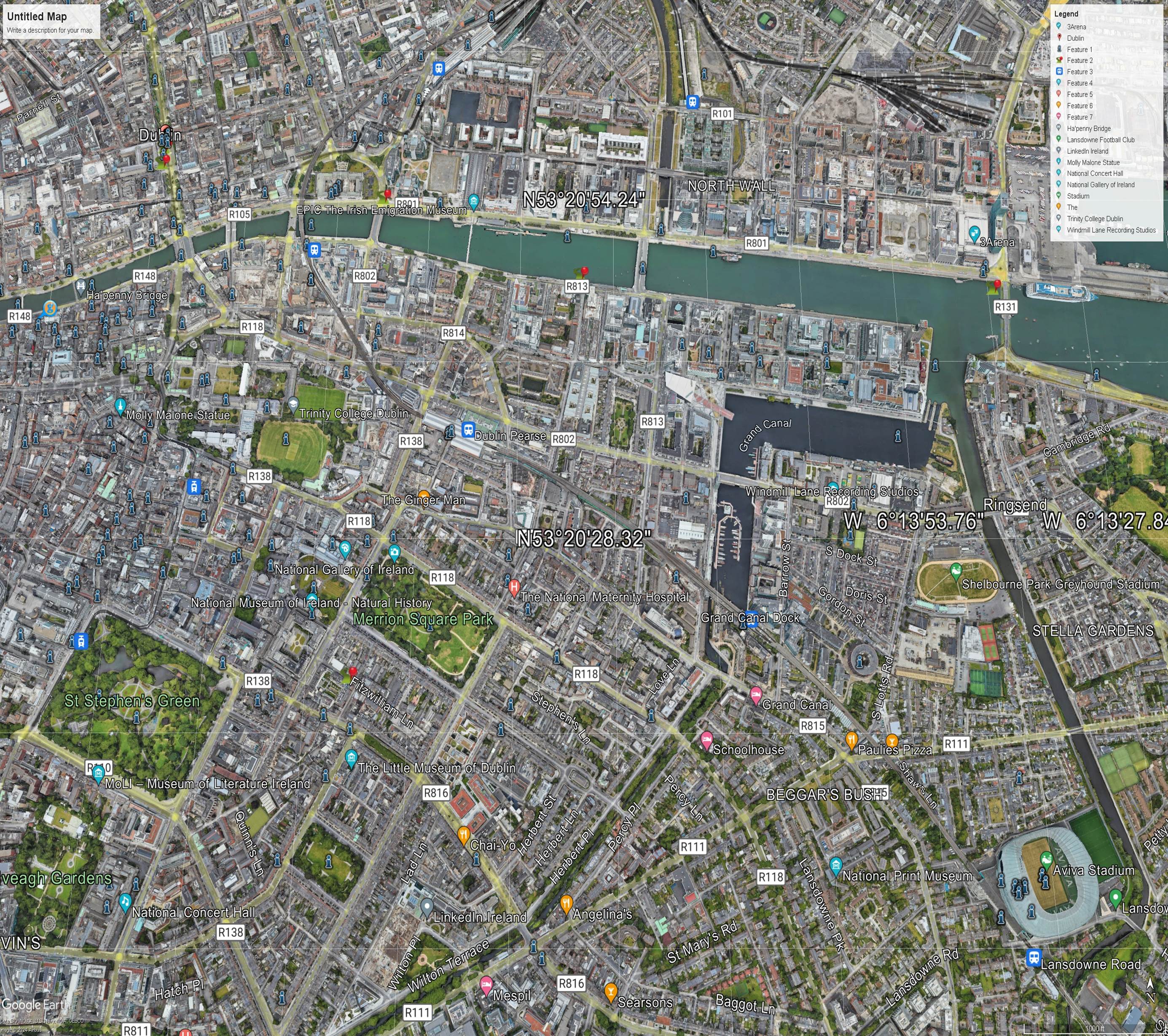 Our excursion today would be a “Walk Through Dublin’s Fair City” and starts, as usual, with a bus ride, although a fairly short one this time. The Sirena is docked in the river Liffey, just on the outskirts of Dublin. I’ll show a Google Earth view of Dublin below because it is useful but also because you can see the Sirena and where it was docked in the image. If you look on the right edge and about 1/3 of the way from the top of the image, you can see the Sirena docked close to a bridge.