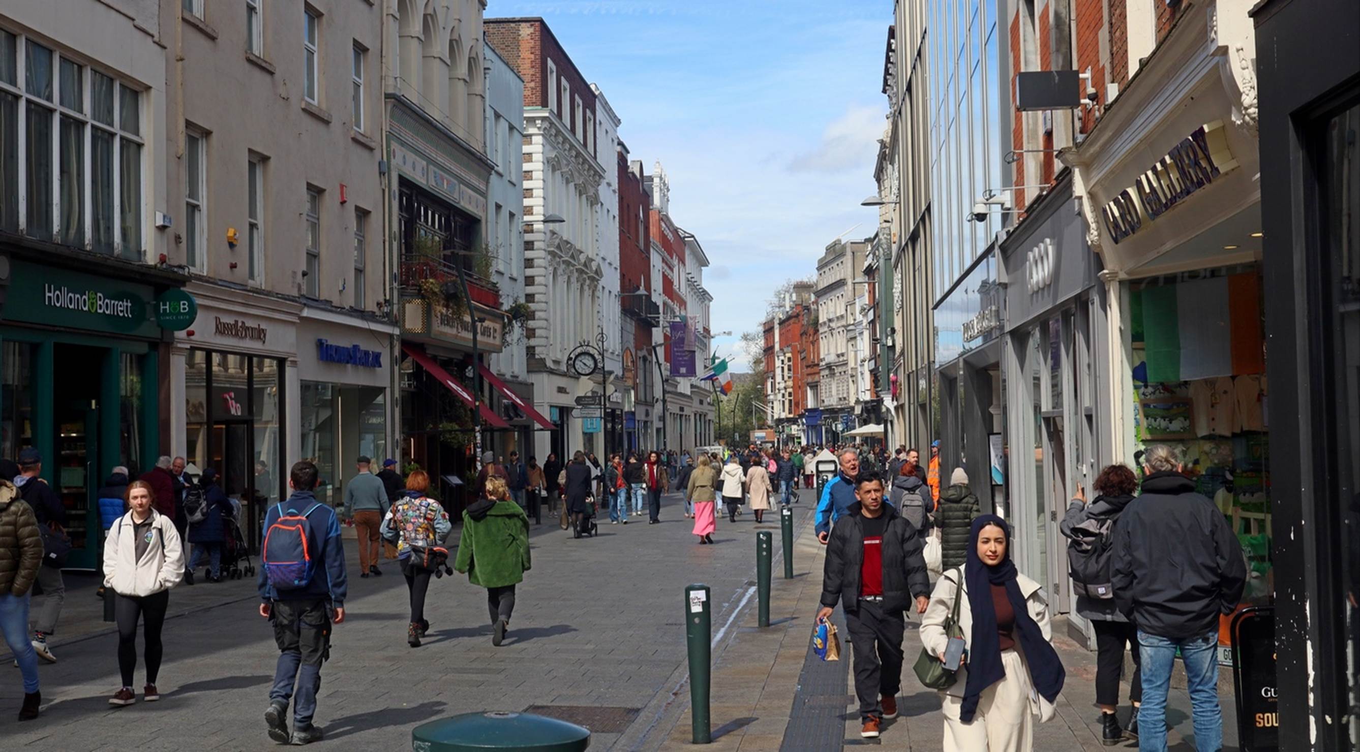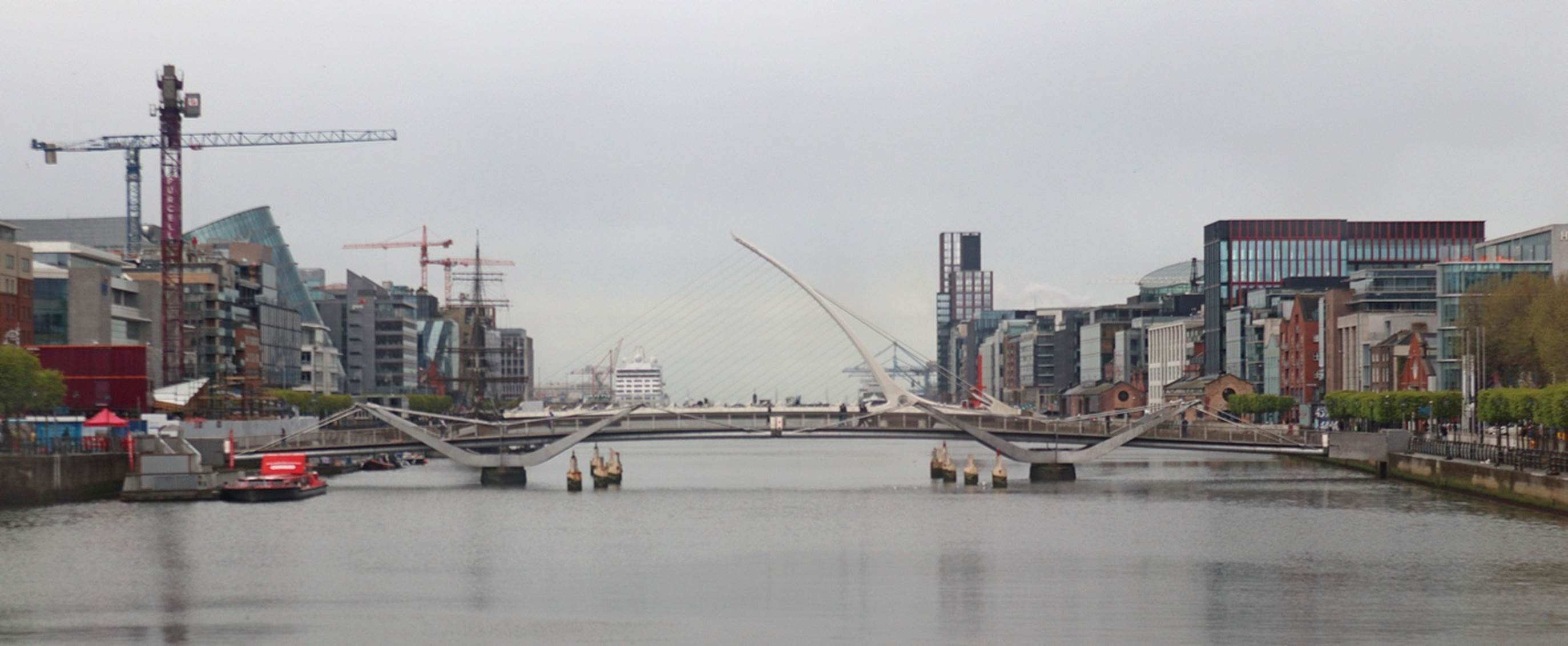 There are several striking bridges that span the Liffey River and you can see several of them in the photo below, as we crossed one of them. You can also see the rigging of the Jeanie Johnson and, in the distance, the Sirena. We continued on the bus as it wound through traffic and narrow streets and finally deposited us in the downtown area.