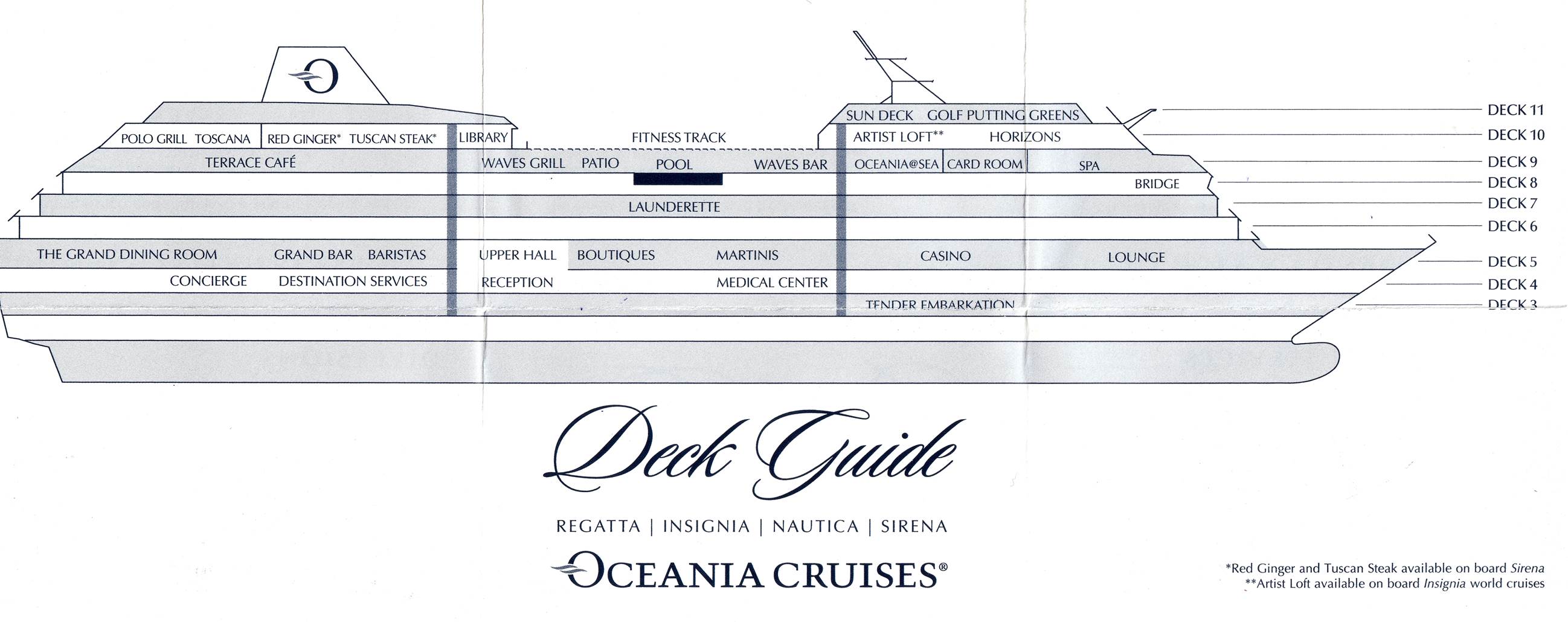 We’ll take a quick turn around the ship, showing some of the features. But first, here is a deck map of Sirena so you can easily find the locations of the places I’ll mention.