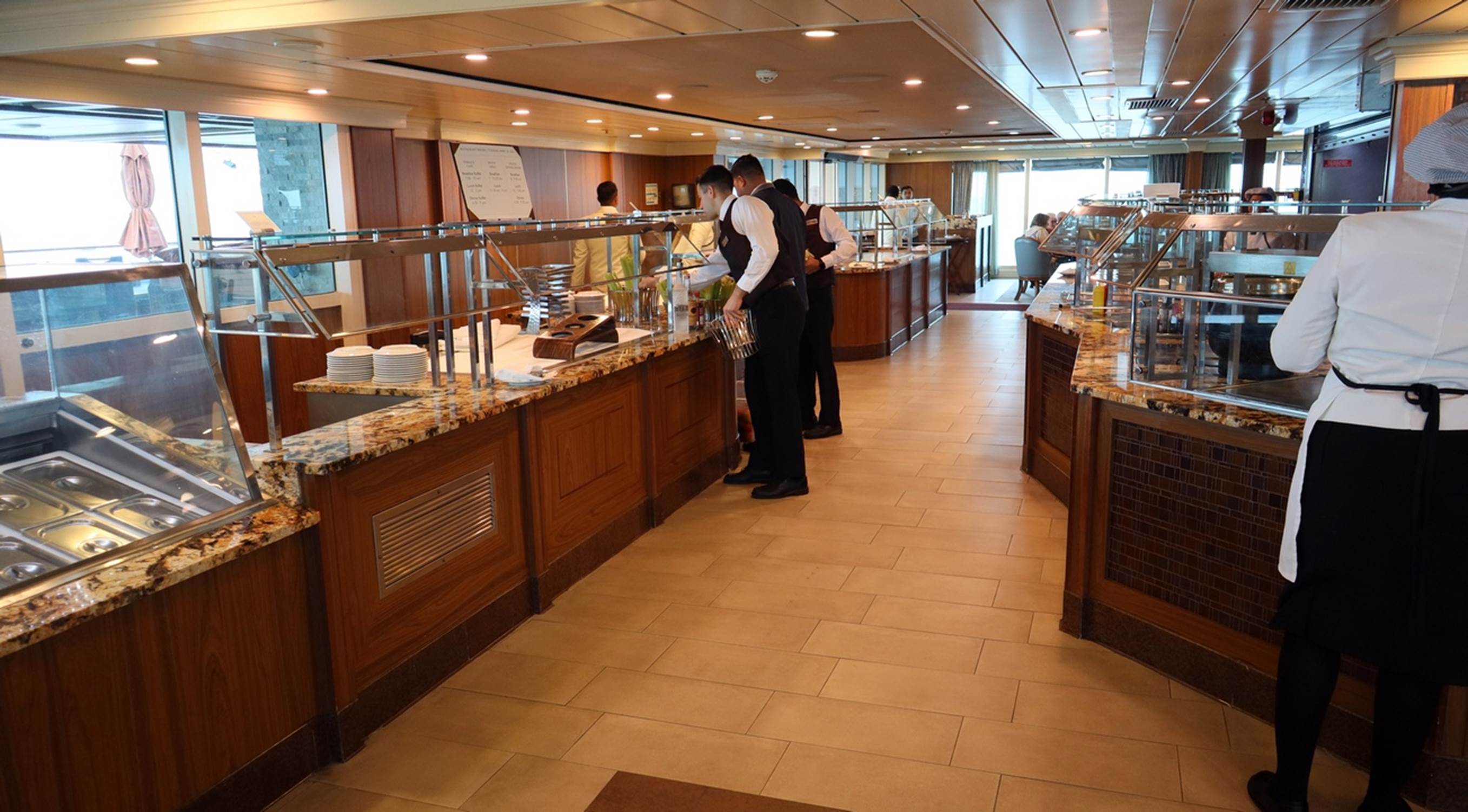 There is a good sized seating area on the exterior deck behind the Terrace that would be nice in good weather, but it was practically always closed on our cruise. This forced more tables into the interior space where seating was rather crowded and it was sometimes difficult to find an open table.