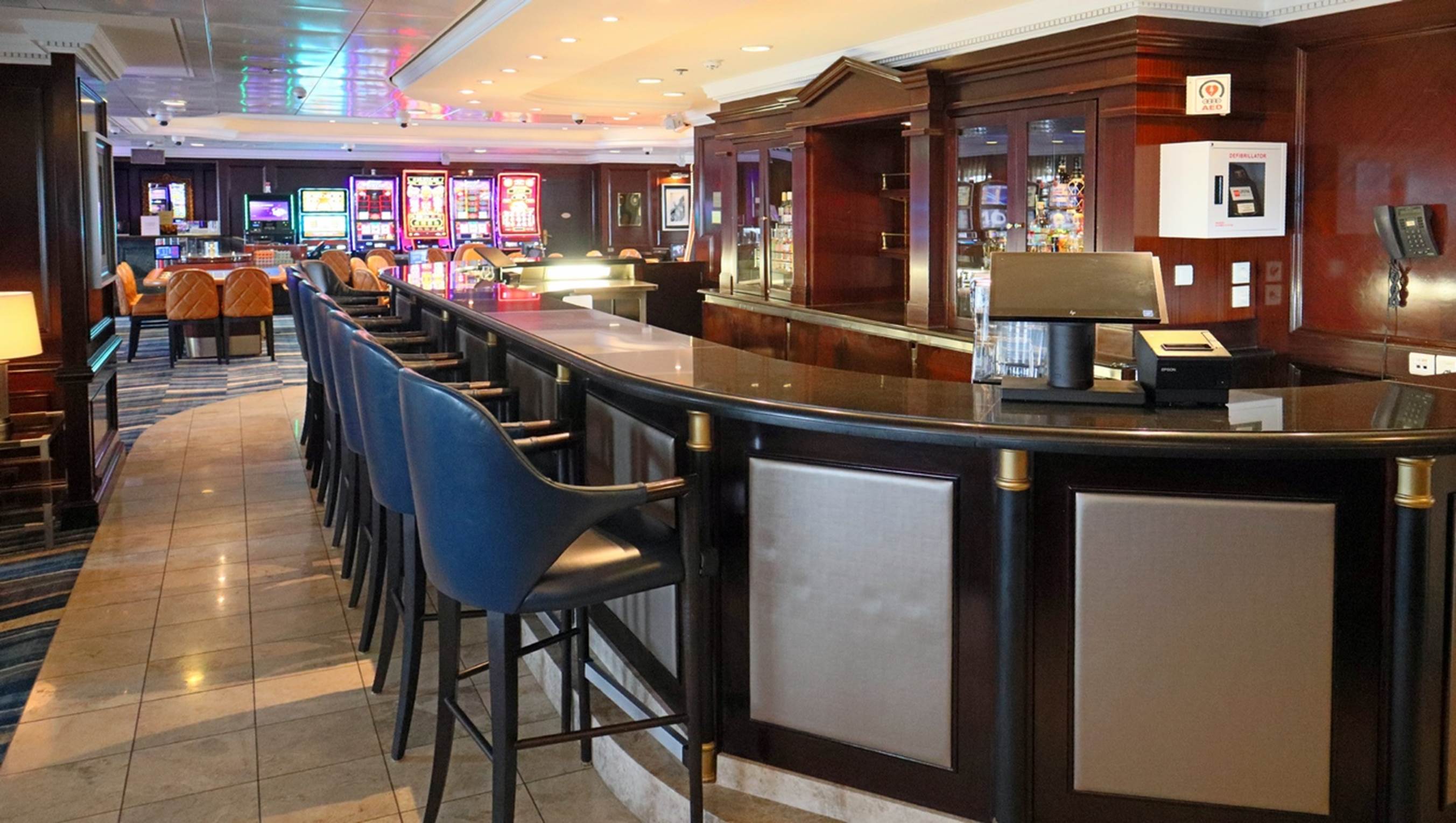 One of the most popular places to relax with before or after dinner drinks was Martinis Lounge (deck 5, mid-ship). Besides the bar seating (below) there were reasonably comfortable chairs and small sofas with tables. There was also a pianist who played before and after dinner. One of the best things about Martinis bar was the main bartender there, Putu. (That’s Putu in the photo at the top right of this page.) He was always cheerful and happy and just seemed to lighten and improve the mood. He was usually assisted by waiter, server, and sometimes bartender, Phillipus. They made Martinis lounge a very nice place to enjoy a glass of before dinner wine or after dinner cognac. If you look past Martinis lounge in the photo below, you can see the small casino which did see a little activity, but not from us.