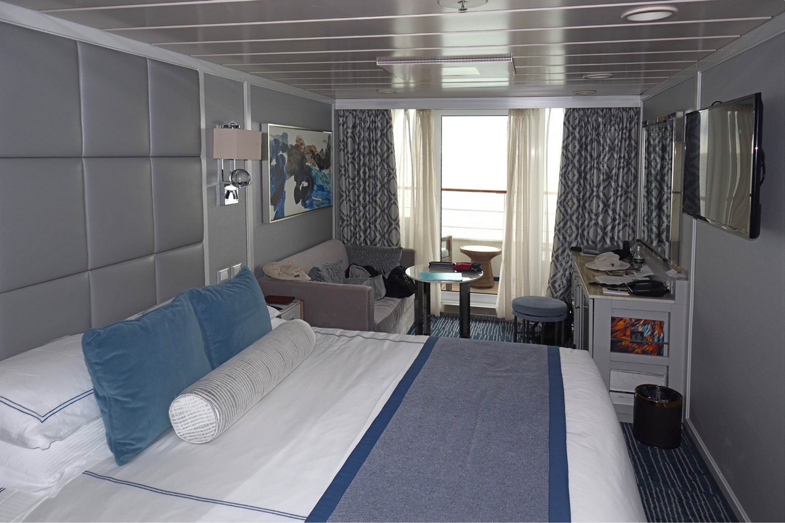 Of course, we spent more time in our cabin than anywhere else on the ship and, unfortunately, our cabin was probably the most disappointing space on the ship for us. This was probably the most popular, or at least the most common, cabin layout on the ship. We had a “Concierge Deluxe Veranda Suite”, mainly because, when we made our reservations, our only choice was this or one of the huge “Owner’s Suites” at a price that I don’t even want to think about. The last 3 or 4 cruise ships we have been on, the equivalent cabin had a total of 277 square feet while this cabin was 210 square feet and a large part of the missing space was in the bathroom: it was definitely small. The shower was especially small. Although I’m fairly tall, I’m not that big, but whenever I dropped the soap or something, I had to plan ahead and decide on a strategy to bend over and pick up whatever I had dropped.