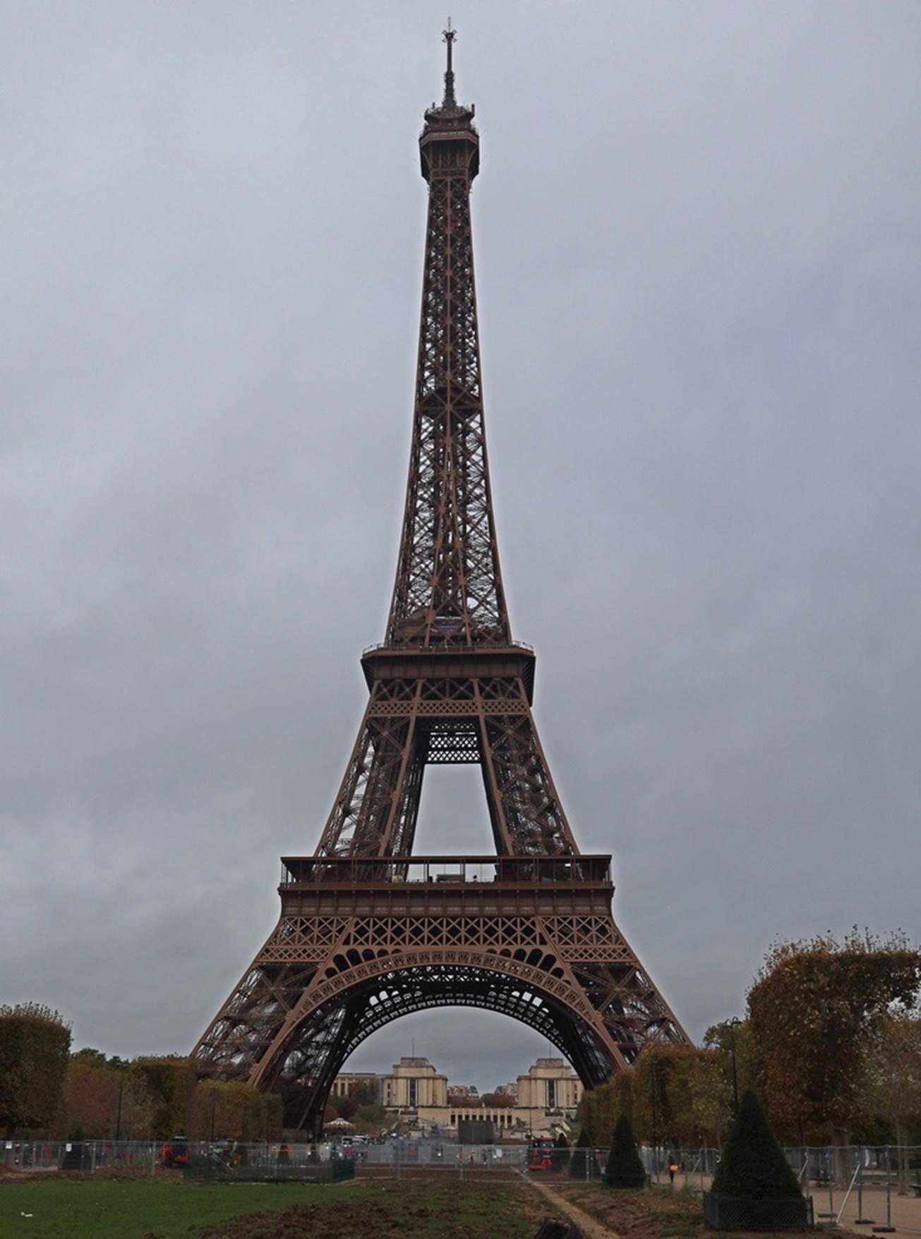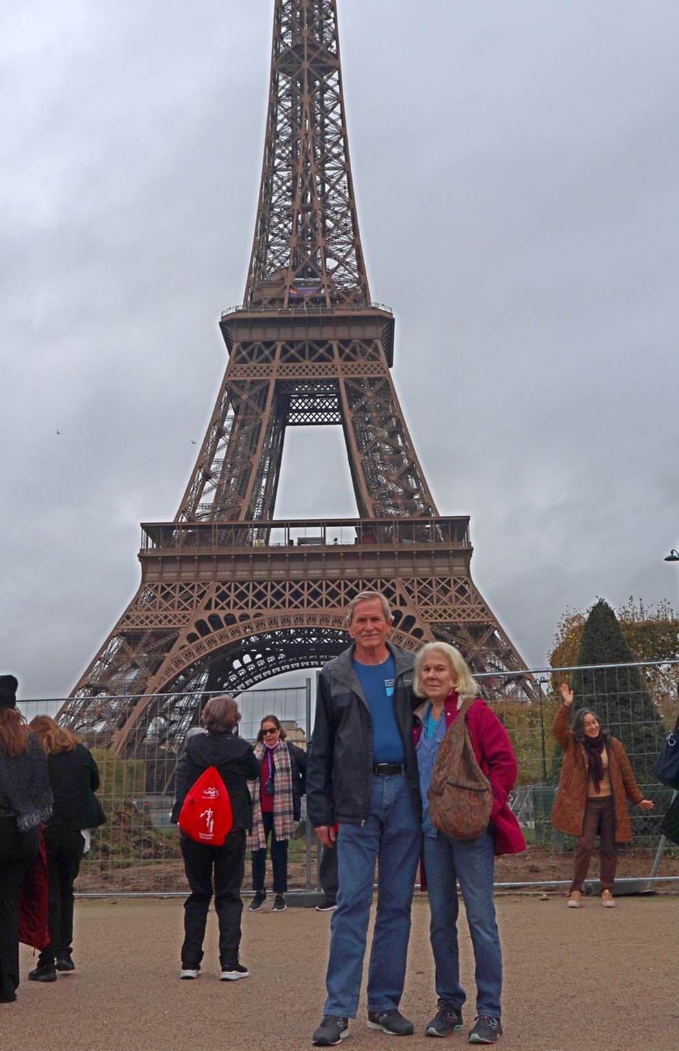 If you look through the bottom arch of the tower, you will see the two buildings and plaza between them where we went to view the tower the previous night. We didn’t hang around very long because it was still raining lightly and there was a rather cool wind. We did take the time to get a “Yes, we really were in Paris.” Photo.