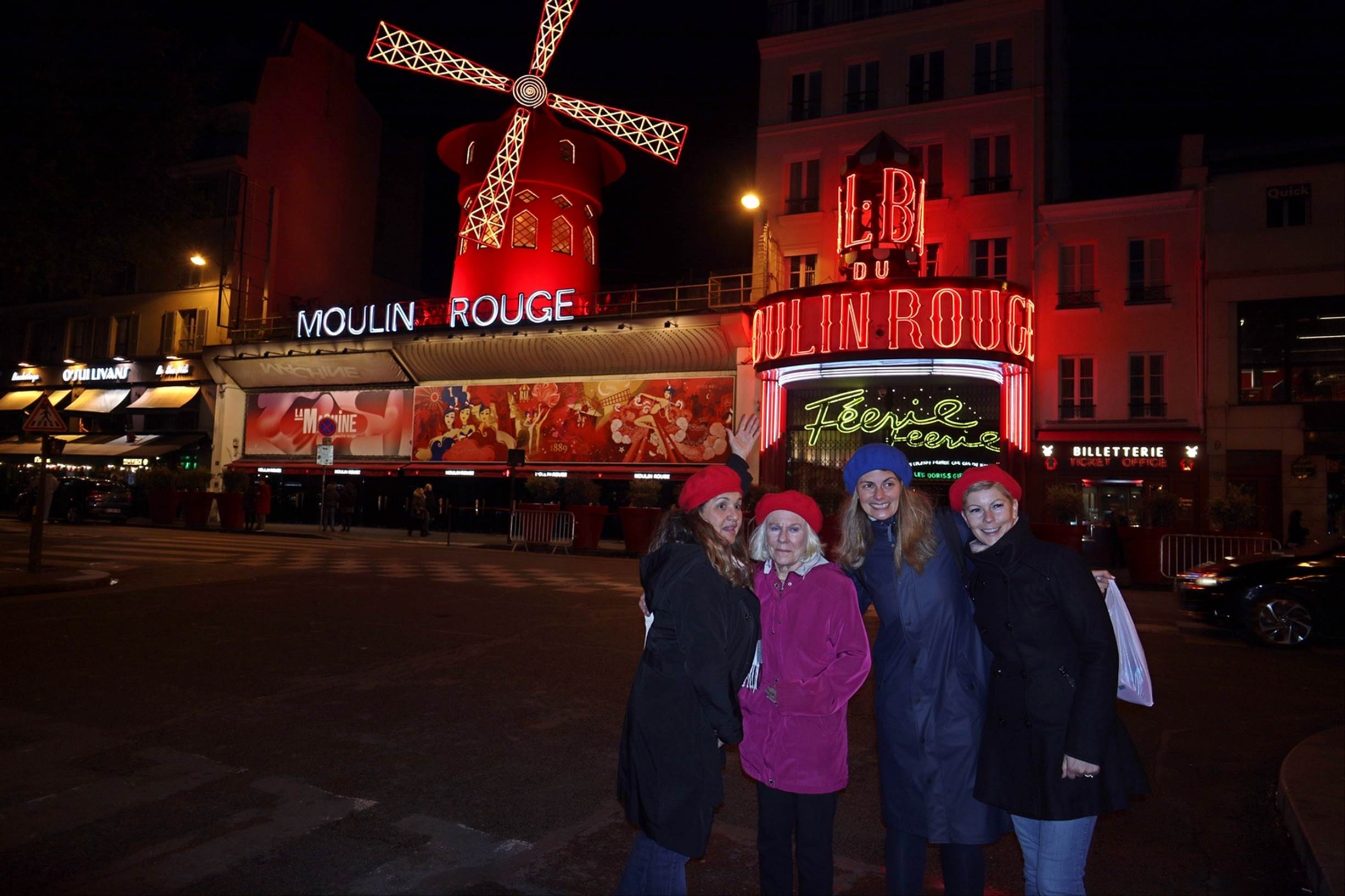 This “transfer station” just happened to be in front of a rather famous Paris landmark, the Moulin Rouge, so we wanted to get some photos in front of that showplace. Marcia had gotten the ladies matching berets to wear to keep their heads and ears warm in the cool night air so we had to get the appropriate photo.