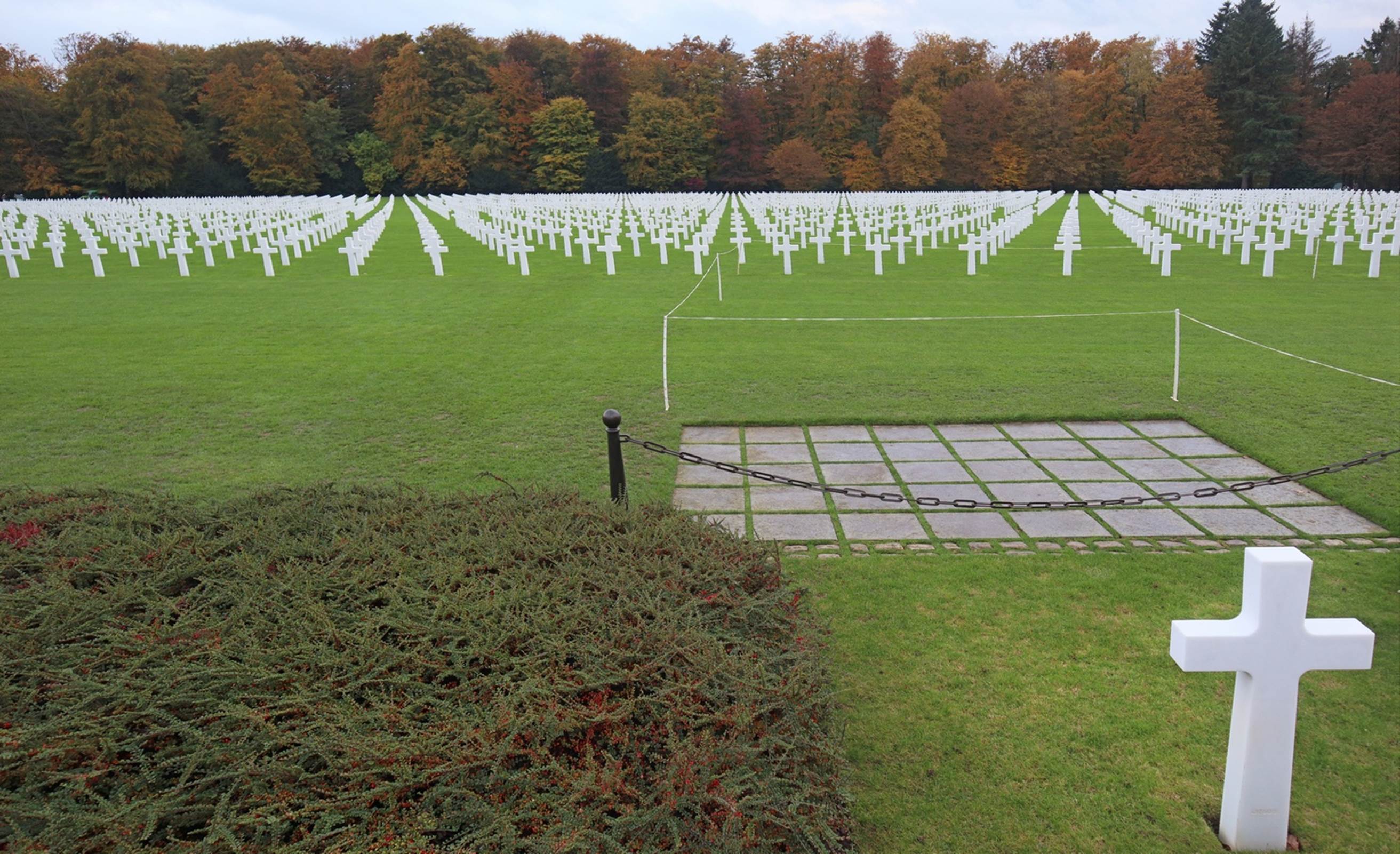 After taking a good look at the cathedral, we walked back to our starting point and loaded back onto the bus. Our final stop in Luxembourg would be a rather somber one, somewhat in keeping with the “Memorial of Remembrance”. We were visiting the American Cemetery of Luxembourg. Here lies over 5000 American soldiers who died in the battles of World War II in this area. Most of the soldiers here died in the “Battle of the Bulge” which was fought nearby. General George Patton played a major role in that battle and he is buried here, although he did not die until about a year after the war was over. (He died in an auto accident which many people believe was not really an “accident”.) Before his death, Patton had said that he wanted to be buried with his men, in a grave like all the others.