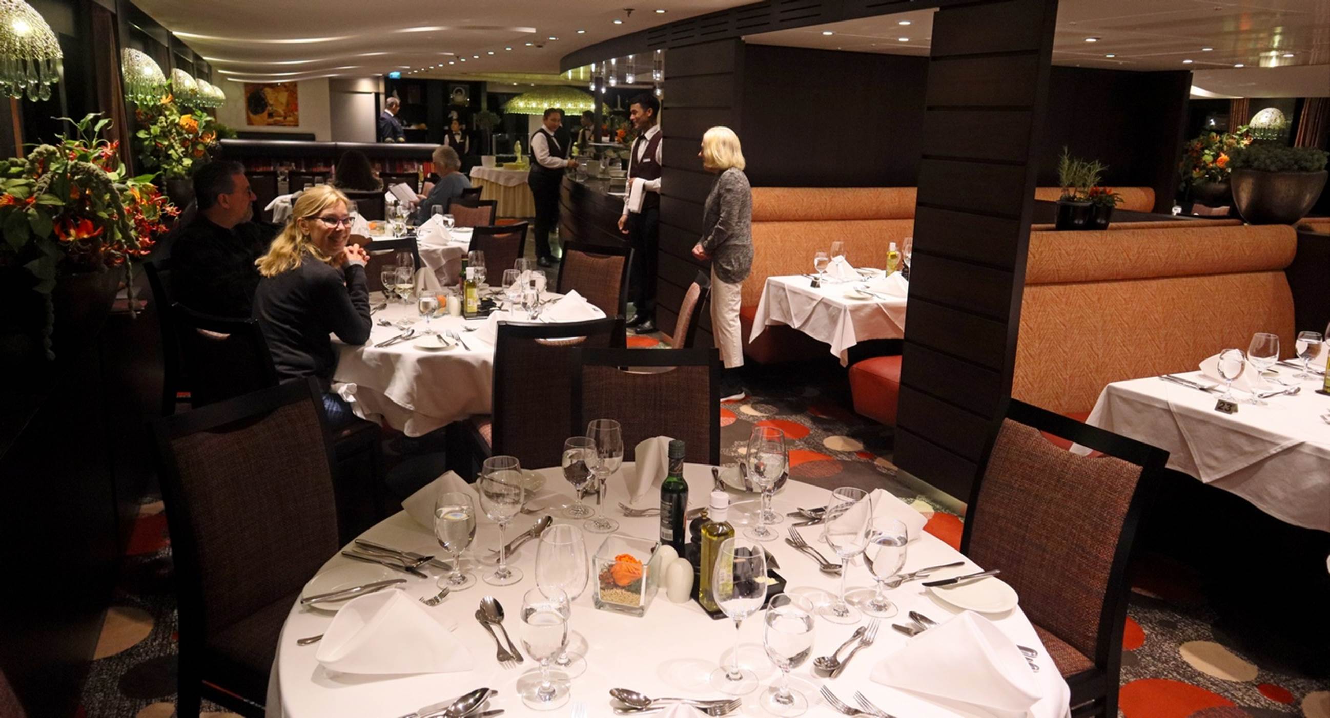 There was one main restaurant on the lower forward deck, under the lounge and a small specialty restaurant, the “Chef’s Table”, at the stern on the third deck (Violin Deck). During meal times, you could also sit in the lounge and have light meals brought up from the restaurant immediately below via a “crew only” stairway.