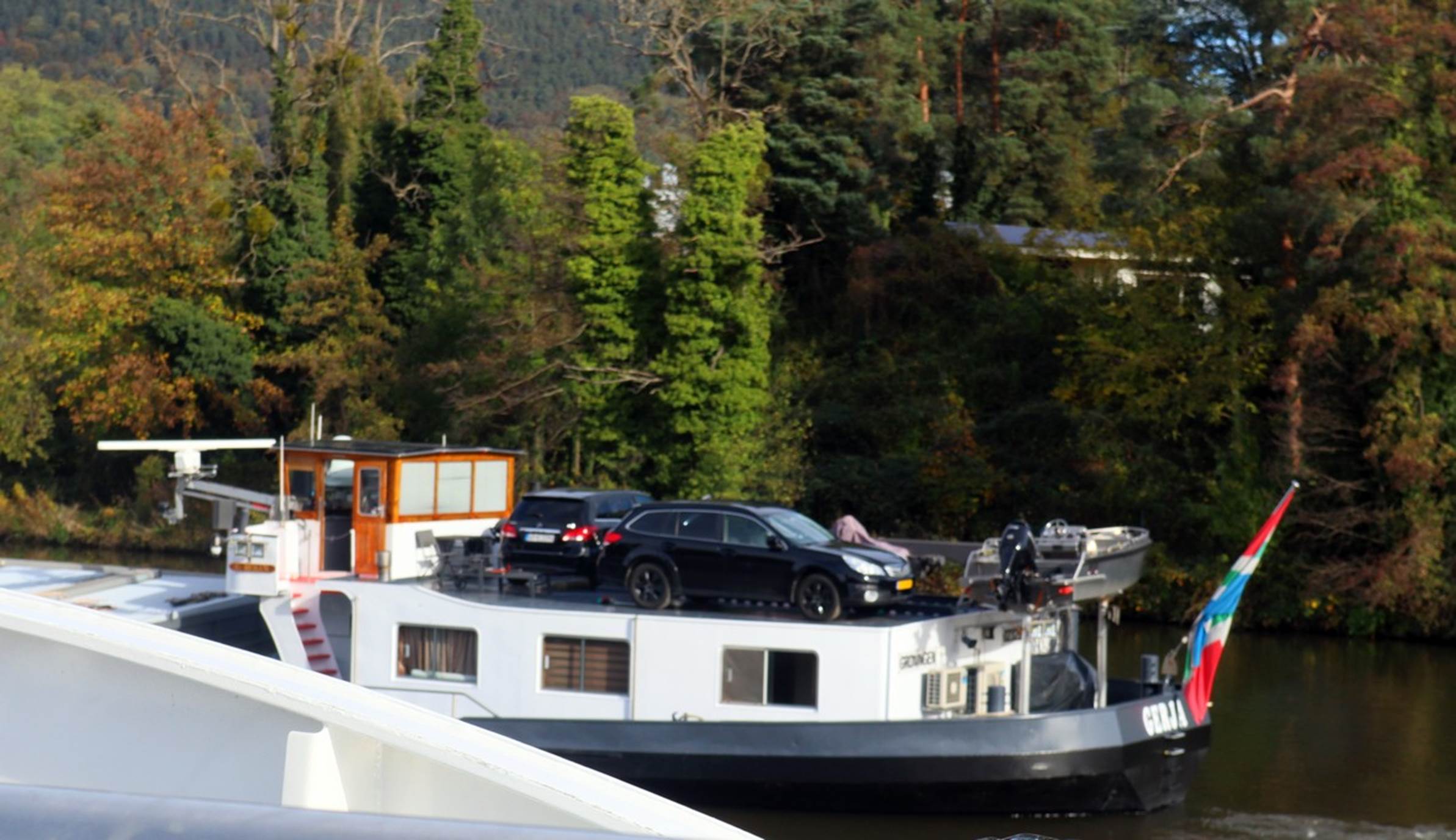 We mostly left the castles back on the Rhine and spent the morning going by many small, but pretty, towns along the Main. Actually, during the night, about 10 – 11PM, we had gone through about the middle of the large city of Frankfurt, but didn’t see much of it in the dark. It was primarily a morning of watching the landscape go by and relaxing. We had noticed one somewhat strange cargo many of the working barges carried along with them.