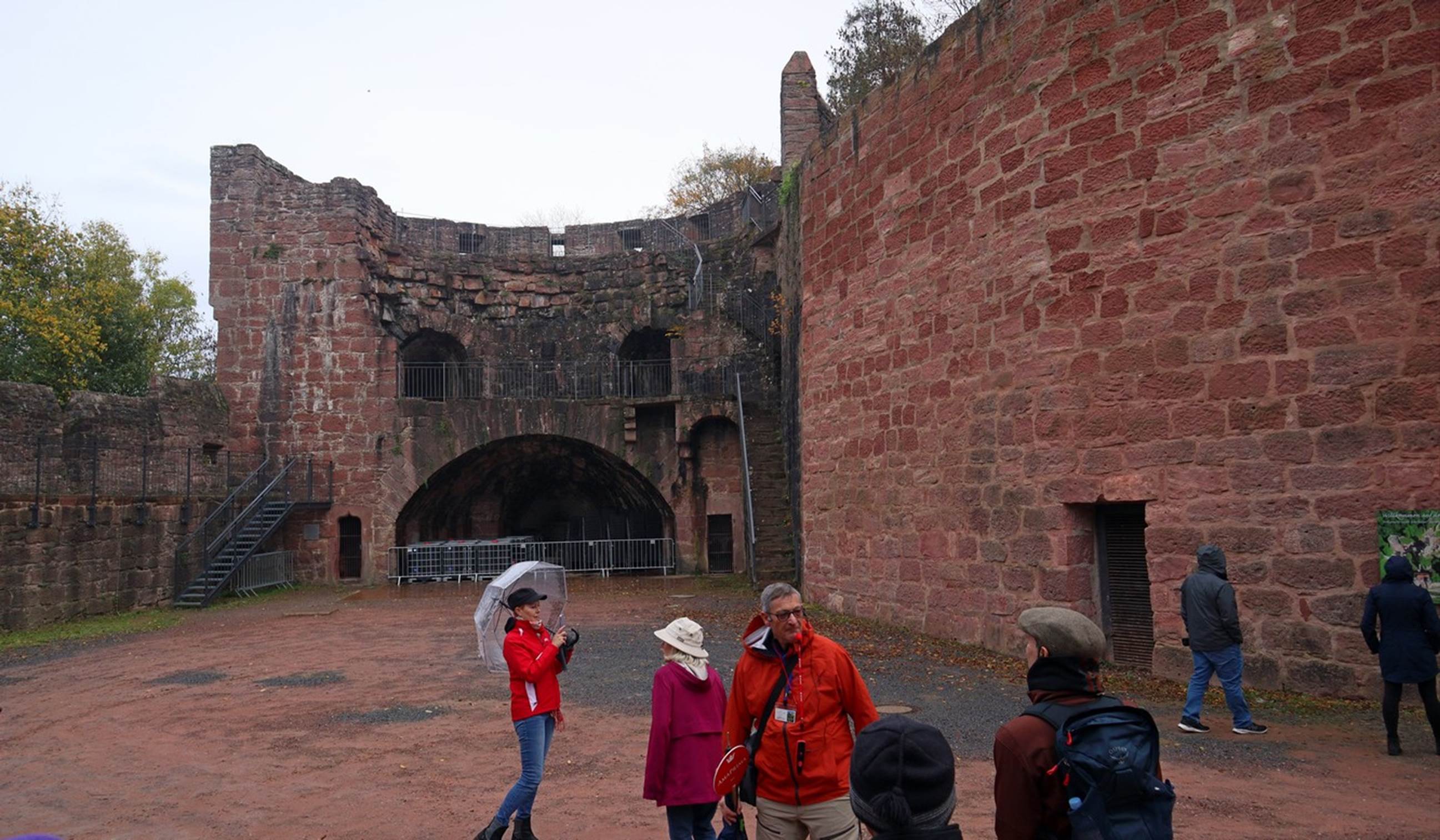 After a very short walk from the bus stop, we had a good view of the fortress above us and the start of the path that would take us up to it. The hill was planted in several levels of vineyards: although on a hill, these vineyards were not as steep as those we saw along the Moselle a couple of days earlier.