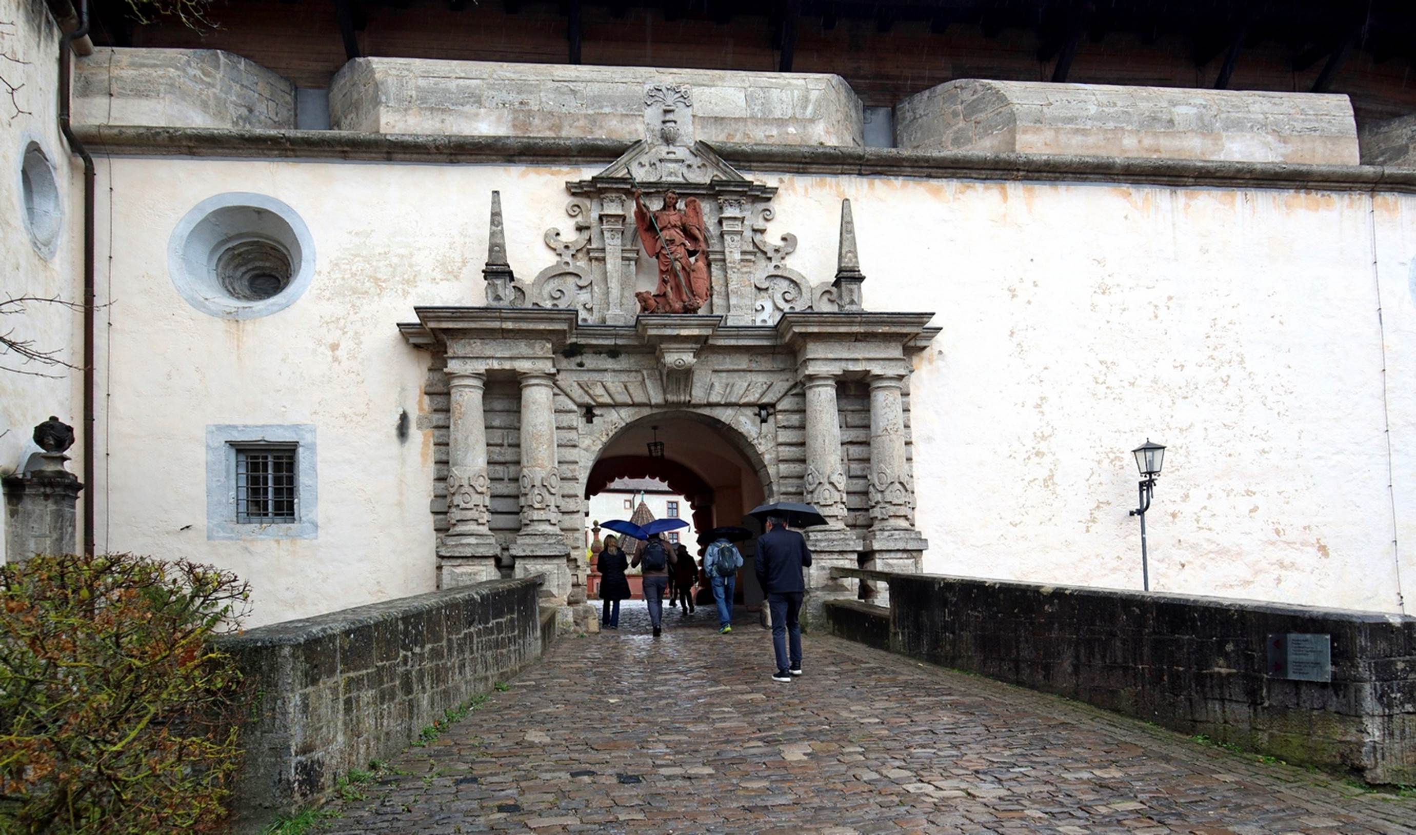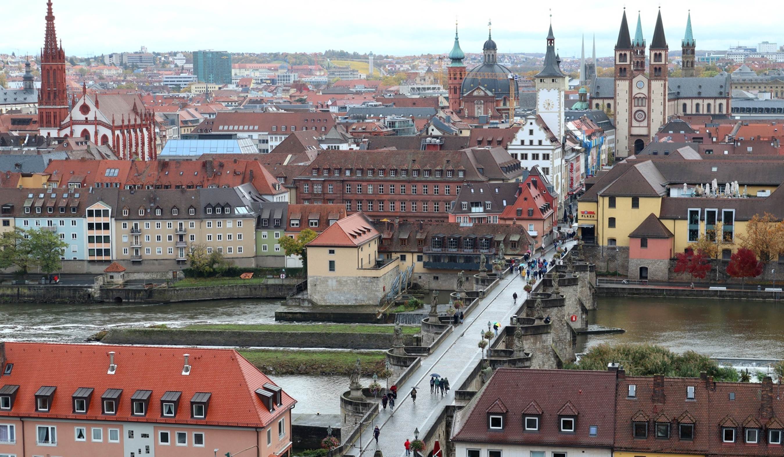 Our tours and activities today would last the entire day, with a hike to a fortress and a wine tasting in the morning, After lunch back at the AmaPrima, we would have another wine tasting on the boat. As with all the tours this day, our “active” hike started with a 30 minute bus ride from a dock at a small town to the city of Wurtzberg. Most of the city is on the east side of the river Main but our objective, the Marienberg Fortress, is on the west side so our bus dropped us off at the bottom of the hill below the fortress, a short block from the river. Like the previous couple of days, there was a almost steady very light rain falling which decreased through the morning.