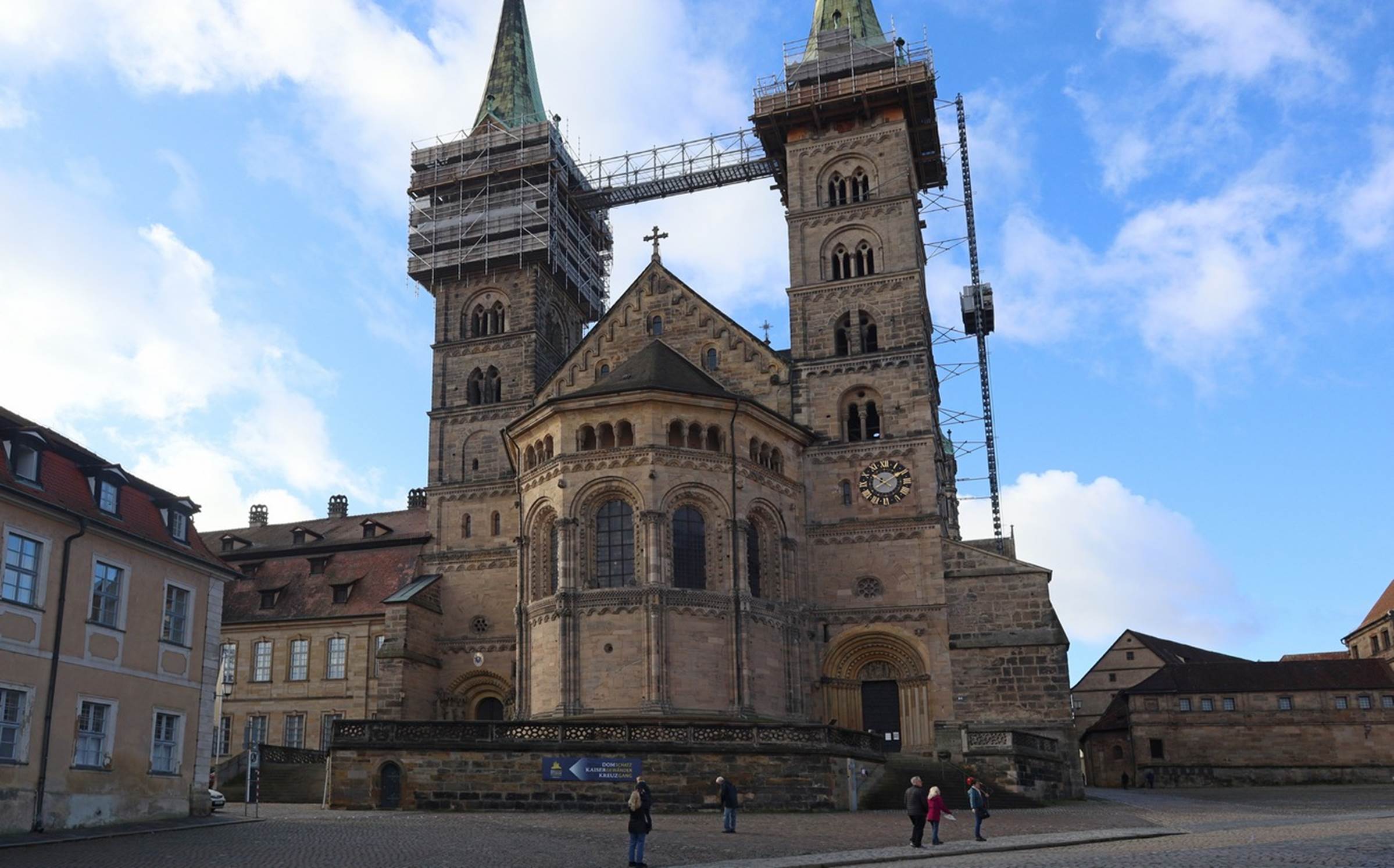 The Bamberg Cathedral sits in one corner of a large square or plaza in the old town, with large buildings in the opposite corner that house the primary museum in Bamberg and some government offices. The cathedral actually has four almost identical towers, with two in the front and two more in the back of the main building.