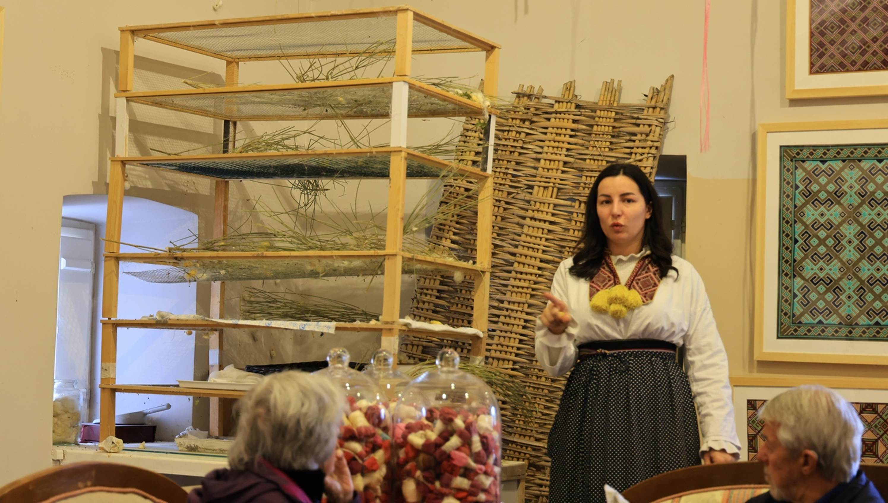 After puzzling over both water wheels for a while, we headed back to the bus and loaded up for a short ride to the Village of Gruda. Here we got a lesson in the raising of silk worms and the production of silk along with lots of information about some of the traditional ways of the area. Our hostess showed us how the women donned their traditional dress, including a very interesting and colorful neckpiece made from the silk they produce here. During the war in the 1990s, the area was occupied by opposing forces and many houses, as well as almost all the historical cloth and dresses were destroyed. Since then, the women of the area have made it their mission to recreate much of the traditional dress and ways of doing things, including producing silk.
