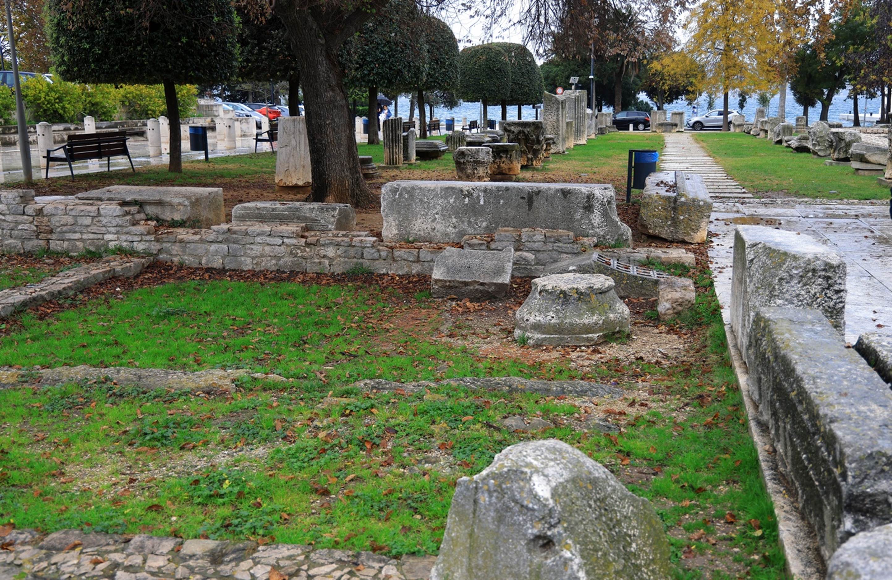 There was a large plaza behind that church, adjacent to the bell tower and another church, with tables and chairs where a cup of coffee (or a class of soda) would have been very nice on a sunny day, but not today! On the other side of the plaza were some fairly extensive roman ruins, the remainder of a Roman Forum here in Zadar. A walkway led through the ruins and down to a wide sidewalk along the waterfront. This was the opposite side of the peninsular from the harbor and faced the open sea, so no boats here.