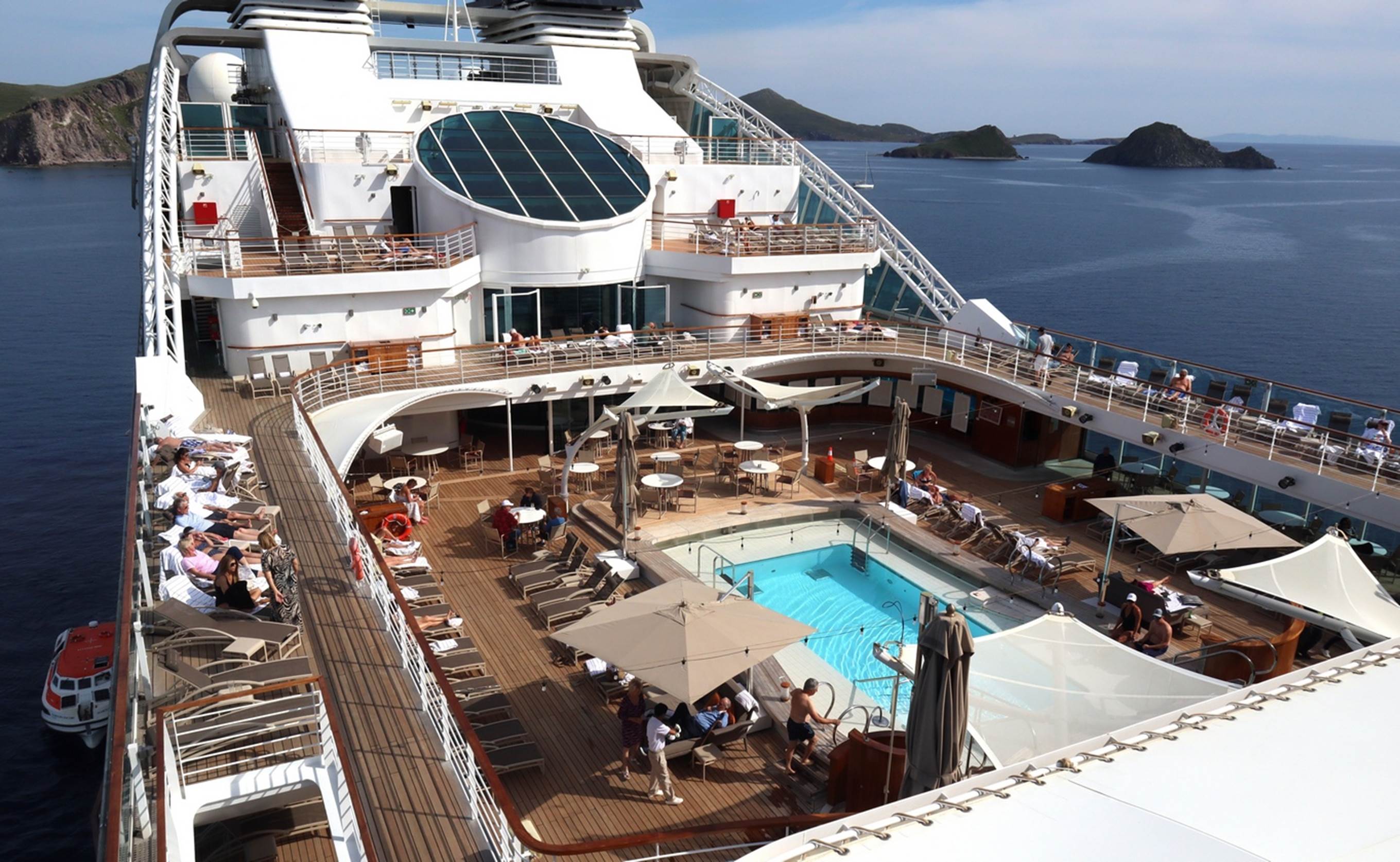 This layout worked very well for us because, largely by accident, our cabin was on deck 9 just a little forward of the pool area, so it was very convenient to many parts of the ship. Most of the ports we called at required the use of tenders (lifeboats) to get to/from the shore and the tender boarding facilities worked reasonably well.