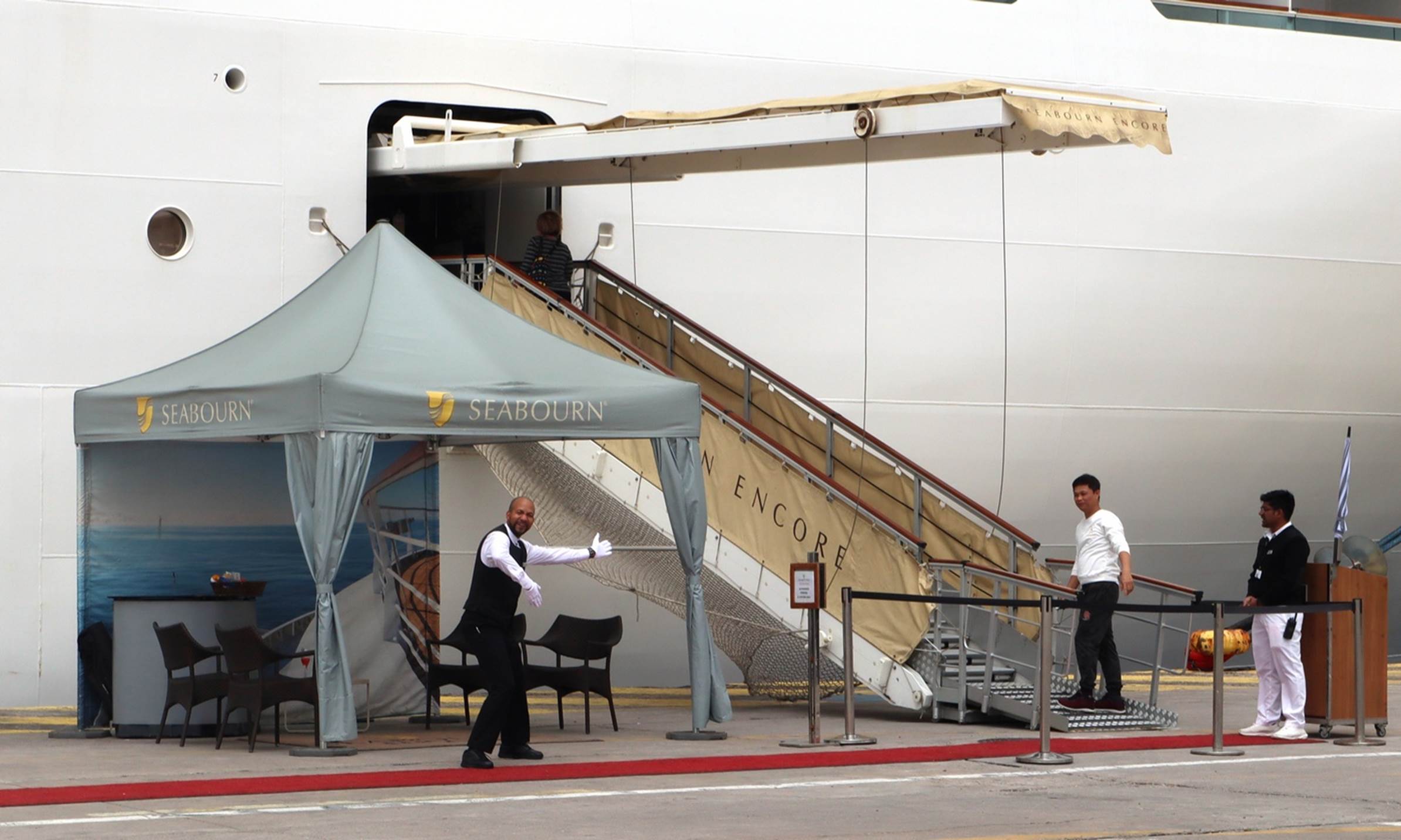 A little before departure time, we retrieved our luggage and, just about right on time, the Seabourn rep ushered us to a car that would take us to the port. I think our driver was in training, as there was a second person in the passenger seat who seemed to be monitoring the driver. It was about 25 minutes to the port of Piraeus, where the Encore was docked. The “check-in” process was quick and easy (I had done most of the check-in on-line about a week previously) and we headed to the ship.
