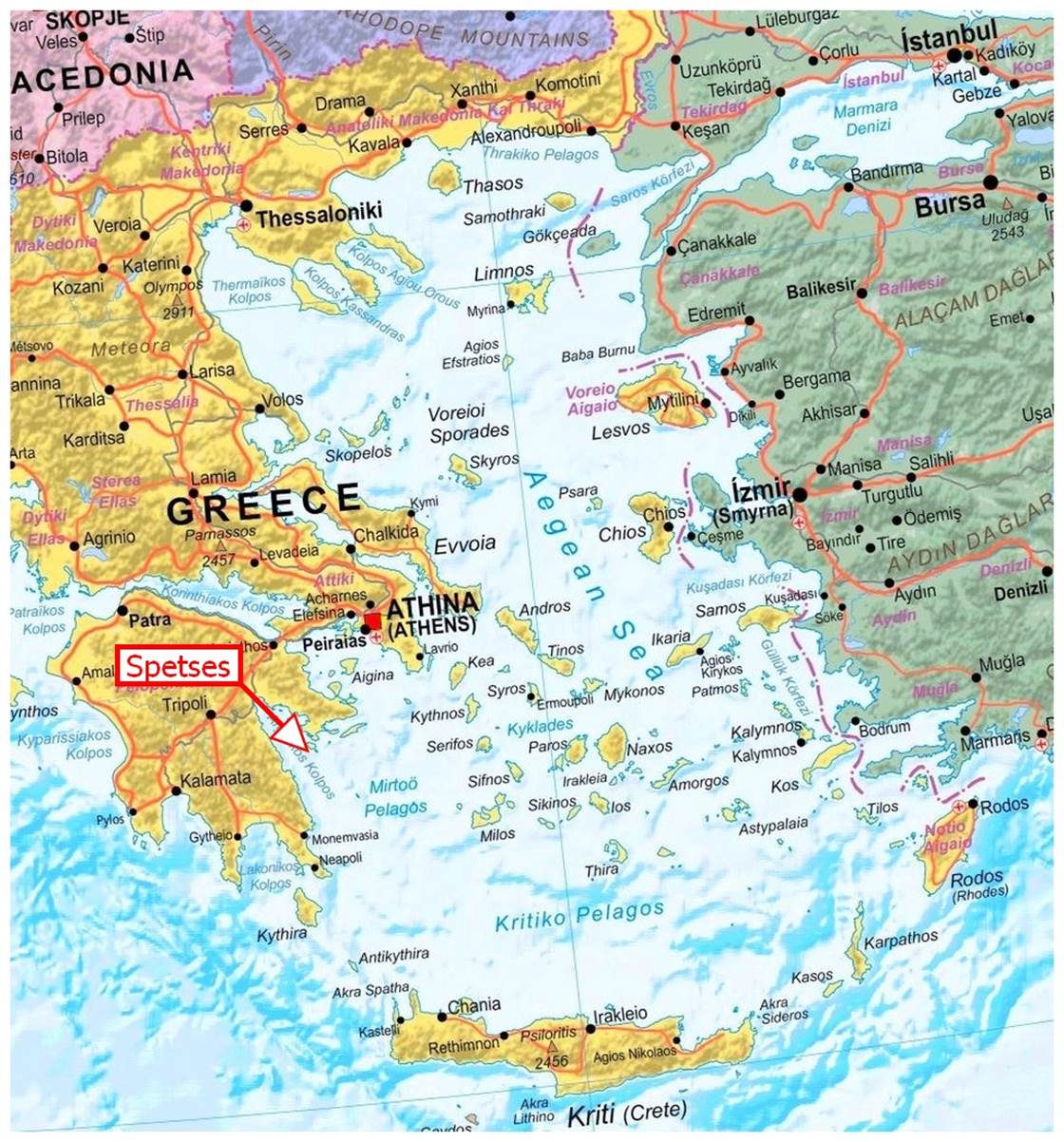 Spetses is a small island just a little off the mainland of Greece, a short distance southwest of Athens. The map above does not show the name Spetses, but the point of the arrow on my label is right at the island.