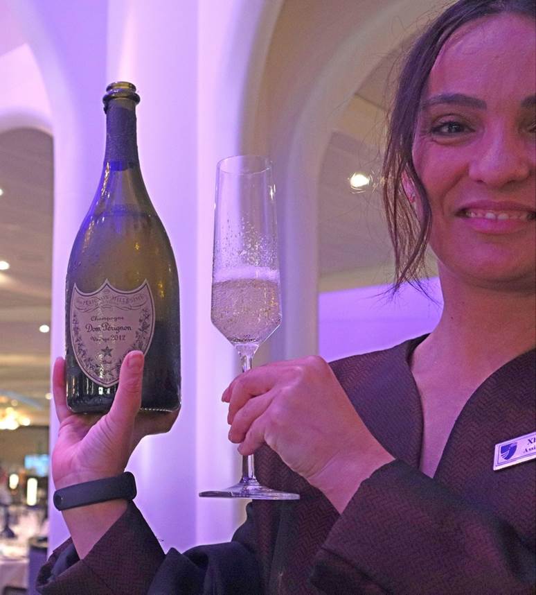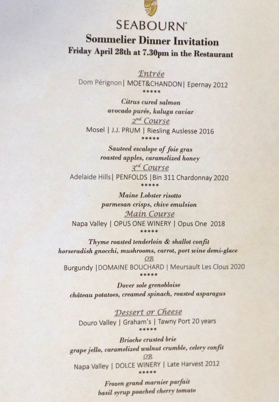 The wines were top notch: any time a Dom Perignon Champagne leads the list, you know it is going to be good. The wine list also included a Penfolds Chardonney and a Opus One (2018) (Cab dominate Bordeaux blend) and several other very good bottles.