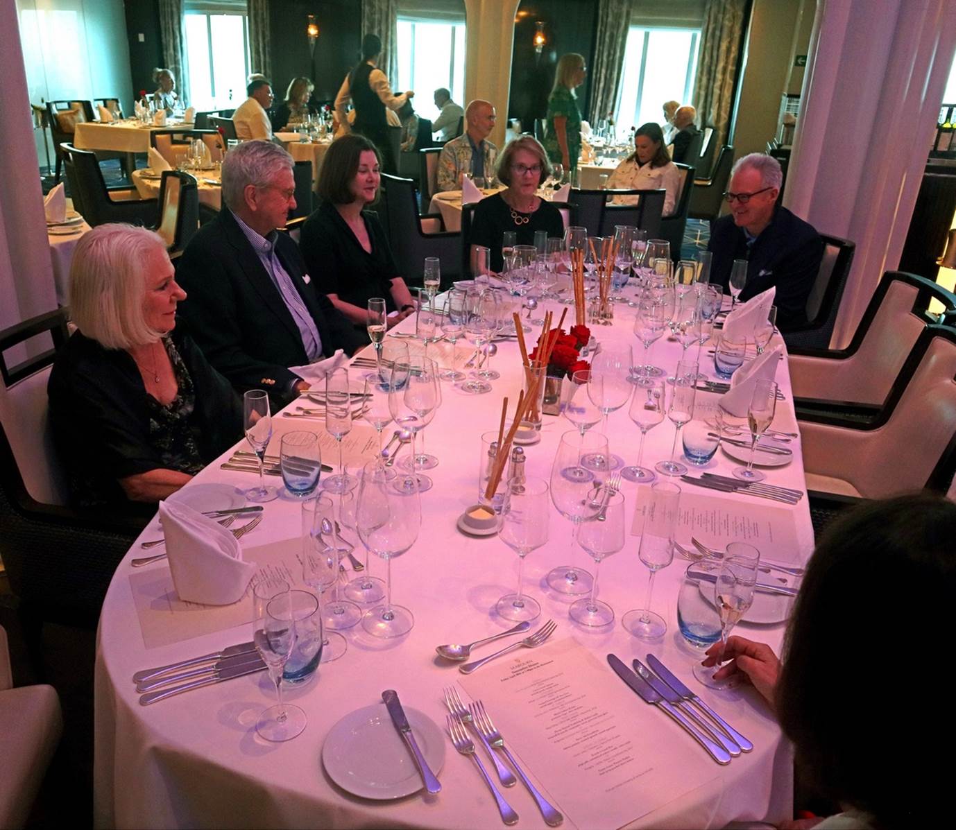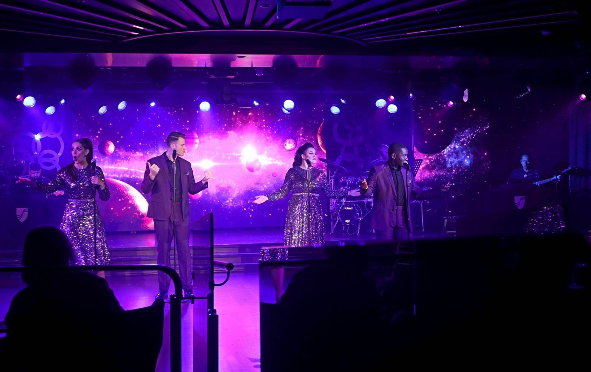 I don’t think we bothered with our normal cognac this evening, after that extensive wine dinner. We did head to the main lounge for the evening’s entertainment, a “song and dance” show of the Encore band, the four vocalists and the two dancers.
