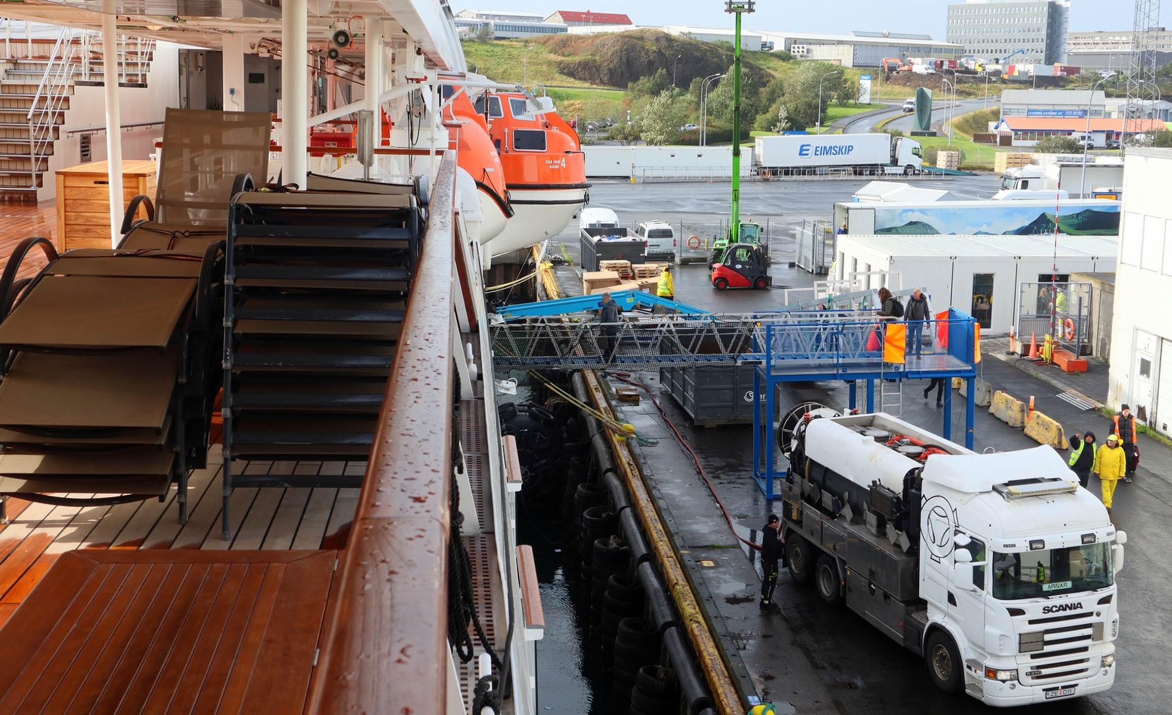 We arrived at the dock about 8:30, much earlier than I expected to be able to go onboard. But, I thought this would be somewhat standard in Iceland, as most of the flights land early, as ours did, and I assumed Windstar would have facilities to take care of us, but I was wrong. We pulled up to the small building at the dock and the security people said that we could not go inside, that we had to stay outside until about 1:00. (Weather: about 45F, wind 15 – 20 mph, occasional light rain.) I knew that there was the main cruise ship terminal a short distance away and our driver said that we should be able to wait there. When we drove there, it was closed and dark: apparently no large cruise ships were scheduled this day, so it would not be of any use. Our driver made a phone call, got a name to use at the Windstar dock, and we headed back there. This time a Windstar officer that I recognized from a previous cruise was in the area and realized we and another couple were somewhat stranded. He arranged for us to have chairs in a small (but heated) back room until we could be allowed to board. It was somewhat interesting watching the process of getting the ship ready to sail again. By now it was about 9:00 and we ended up waiting until about 11:00.