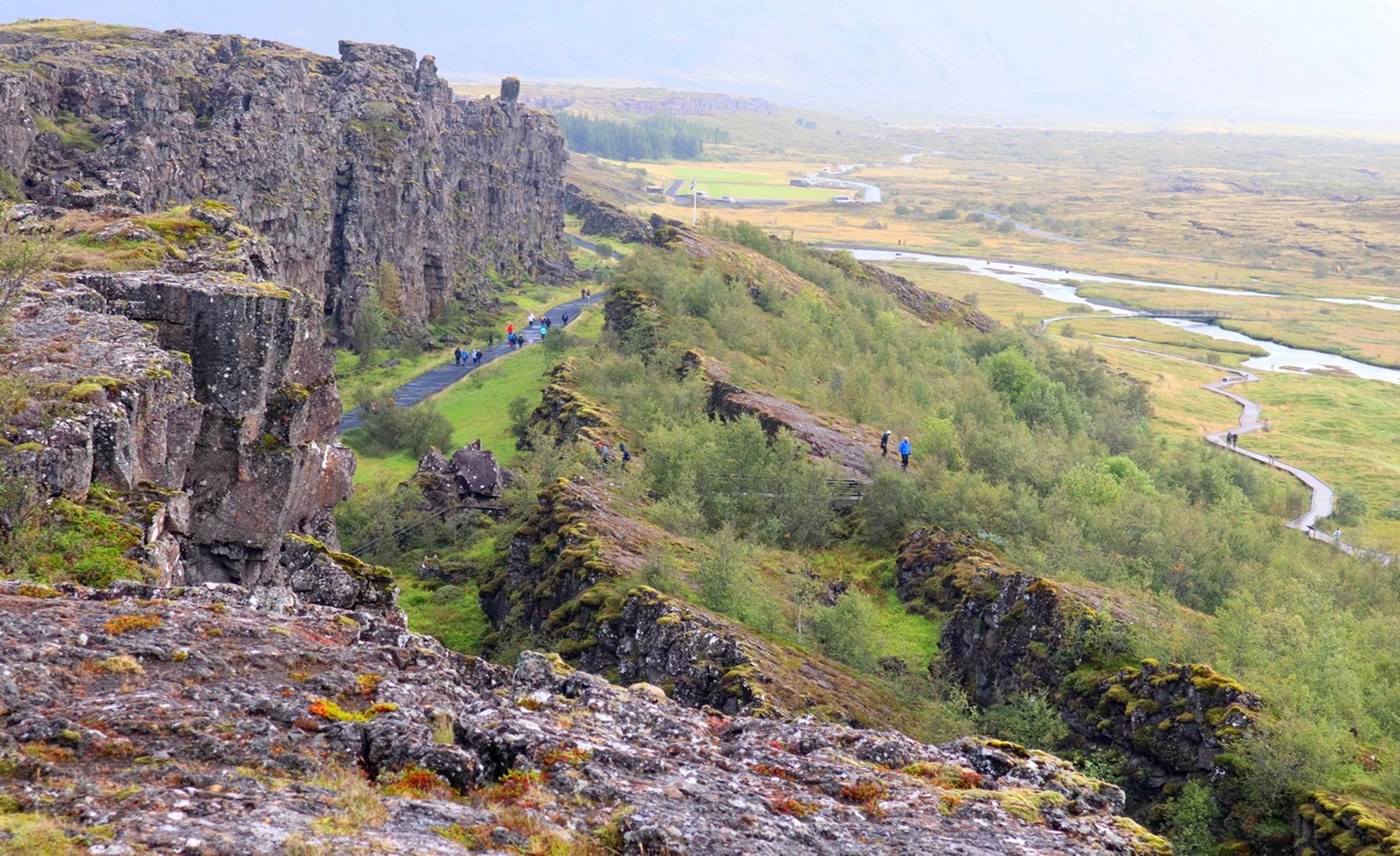 We first checked out a viewing platform from which we could look out over a large flat plain area, which was very different from what we were standing next to. From the viewing area, we walked down a sloping walkway which went between two vertical cliffs of volcanic looking rock. This walkway effectively takes the same path as the riff between the tectonic plates and the distance between the two cliff walls represents the distance apart that the two plates have moved over the past several hundred years.