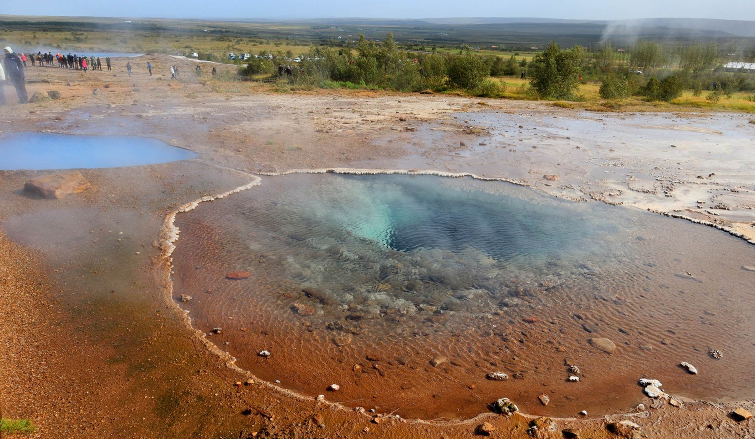 After lunch, we walked across the road to the hot springs area. Although Geysir no longer erupts, another hot spring there, Strokkur, does erupt about every 5 – 7 minutes… or so they said. We stood watching for about 15 minutes and all I ever saw was more like a “burp” rather than an “eruption”. This hot springs area did remind me of a small Yellowstone in several ways, including the steam coming off the hot pools and the color in some of the areas. You would probably get a better idea of the steam from this video of the hot pools.