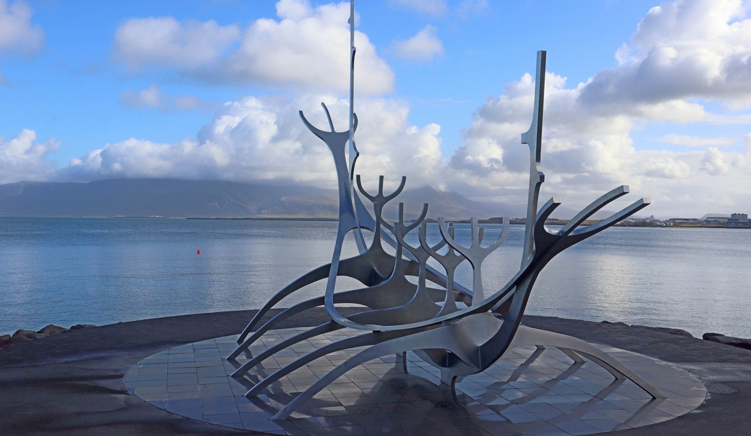 The lighthouse had steps/ramps up to it so I assumed it was decorative, but it was commissioned in 2019 and serves as an actual aid to navigation, although I suspect that its decorative value is more significant than its navigational value. A little further on, closer to downtown, we came to what is probably the best known of the sculptures along the walkway, or possibly in all of Iceland, the Sun Voyager. Constructed of stainless steel in 1990, it gleams in the sun as a striking sculpture. Although it definitely appears to represent a stylized Viking longboat, that apparently was not the intent: “It is a dream boat and an ode to the sun. It represents the promise of undiscovered territory and a dream of hope, progress and freedom.” Whatever the actual intent, it is a striking work of art.