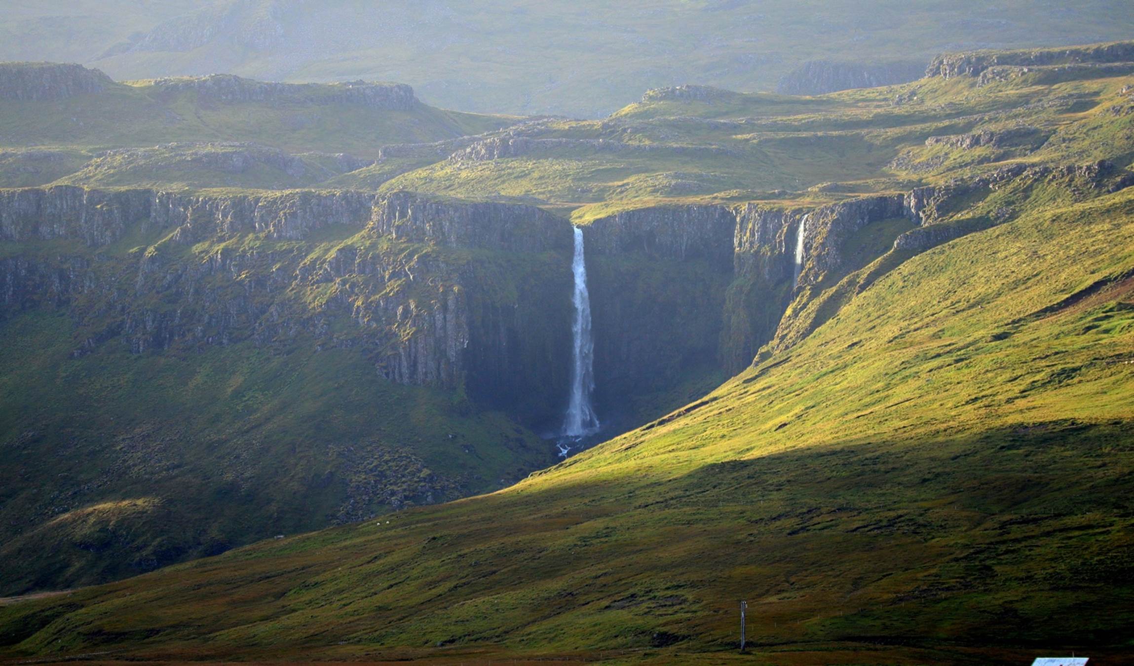 Pretty soon, Captain Rowden comes on the PA system and you can tell he is a bit frustrated. He announced “The forecast was for winds of 20 – 25 knots, but we are actually seeing 30-40 knots and we cannot safely or comfortably operate the tenders in this wind. We are making another change to the itinerary and heading directly to Isafjordur today: we expect to get there and dock about 3:00.” So, up came the anchor and the ship turned and headed out of the fiord. Besides seeing the town and surrounding mountains from the ship, we did see a very tall waterfall in the distance as we left the bay.