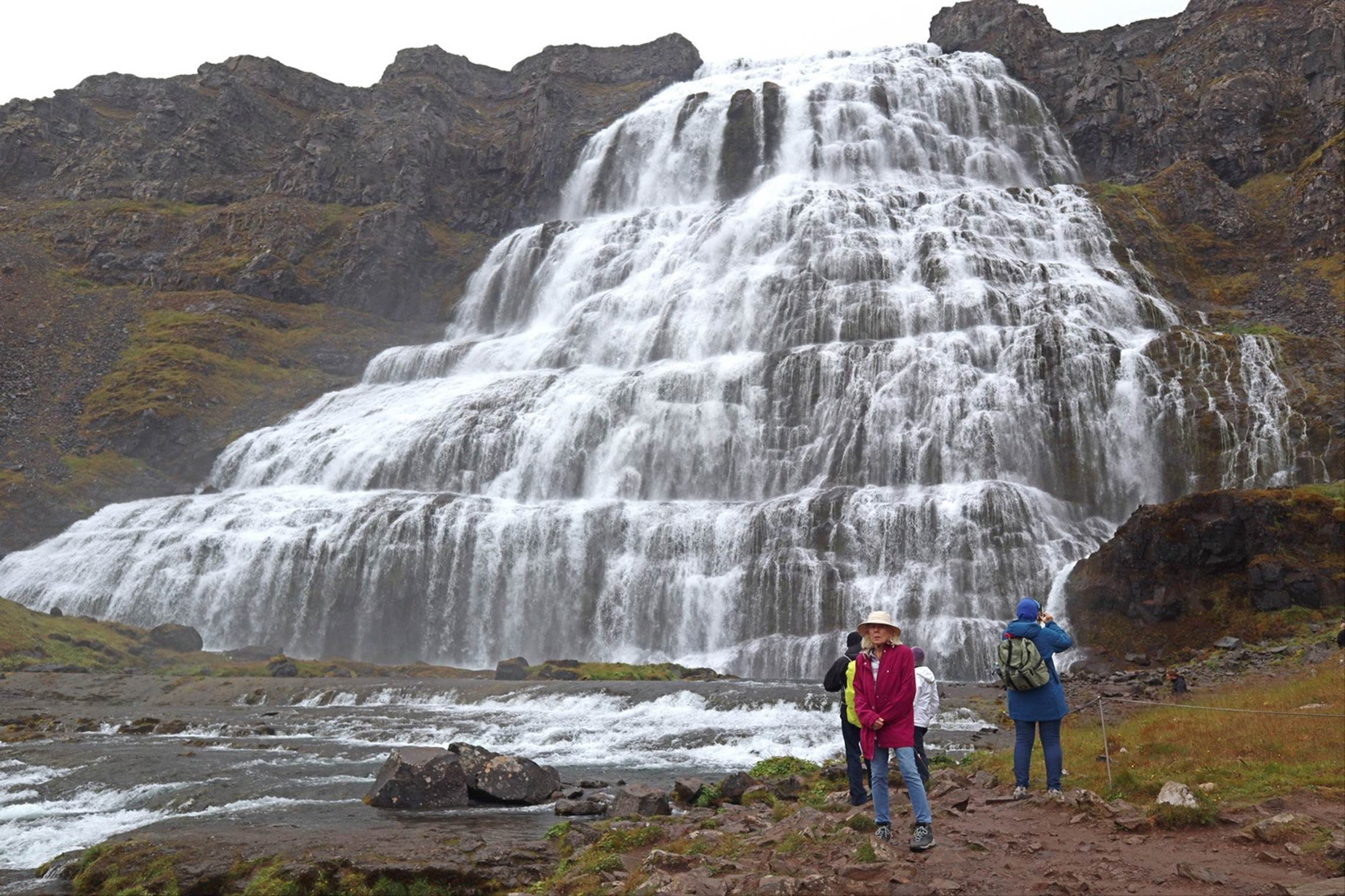 We walked around for about 90 minutes before heading back to the ship to await lunch time and then our 2:15 excursion to the waterfall. As the 2:15 time approached, we met in the lounge then headed to the three busses that would take us to the Dynjandi waterfall. We got on the first bus, which was a small, 18 passenger one while other people got on larger busses of about 40 and 50 passengers. (The number of busses and the sizes will make a difference later.) Since we were in the smaller bus and it got loaded quickly, we managed to stay ahead of the other busses for the entire trip. It was an interesting one hour trip to the falls with our guide providing information about the area and the roads, including the long (7 kilometer and 4 kilometer) tunnels we passed through.