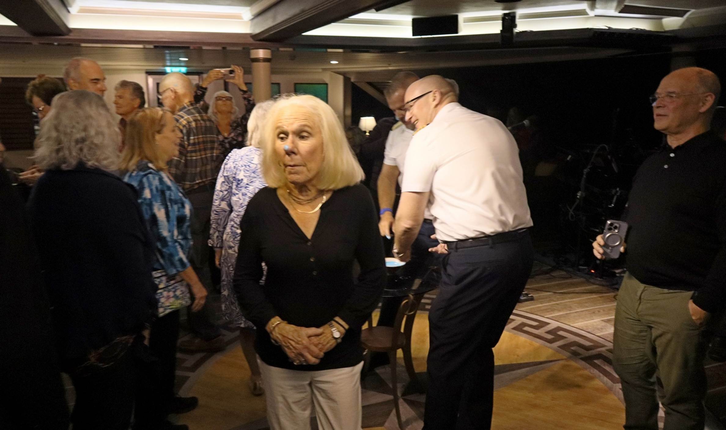 A mostly normal evening followed, with us having dinner in Amphora with a pleasant couple from Phoenix. The big event was the “Blue-nose” ceremony. About 9:00 that evening, we crossed the Artic Circle. We didn’t really need to on our modified itinerary, but it was part of the original itinerary and I think Captain Rowdan took us out of our way so we could have the experience. Apparently, part of the tradition of crossing the Artic Circle for the first time is to have a blue dot placed on your nose, representing the color your nose would be if it stayed out in the cold air too long. The kitchen supplied a sort of blue (food coloring) paste and the captain and the hotel manager (2nd in command, Andreas Pitsch) applied the blue noses to everyone who wanted one in the Compass Rose. And naturally, the celebration was even more reason for drinking and dancing that evening. The next day we received certificates documenting our crossing of the Artic Circle.