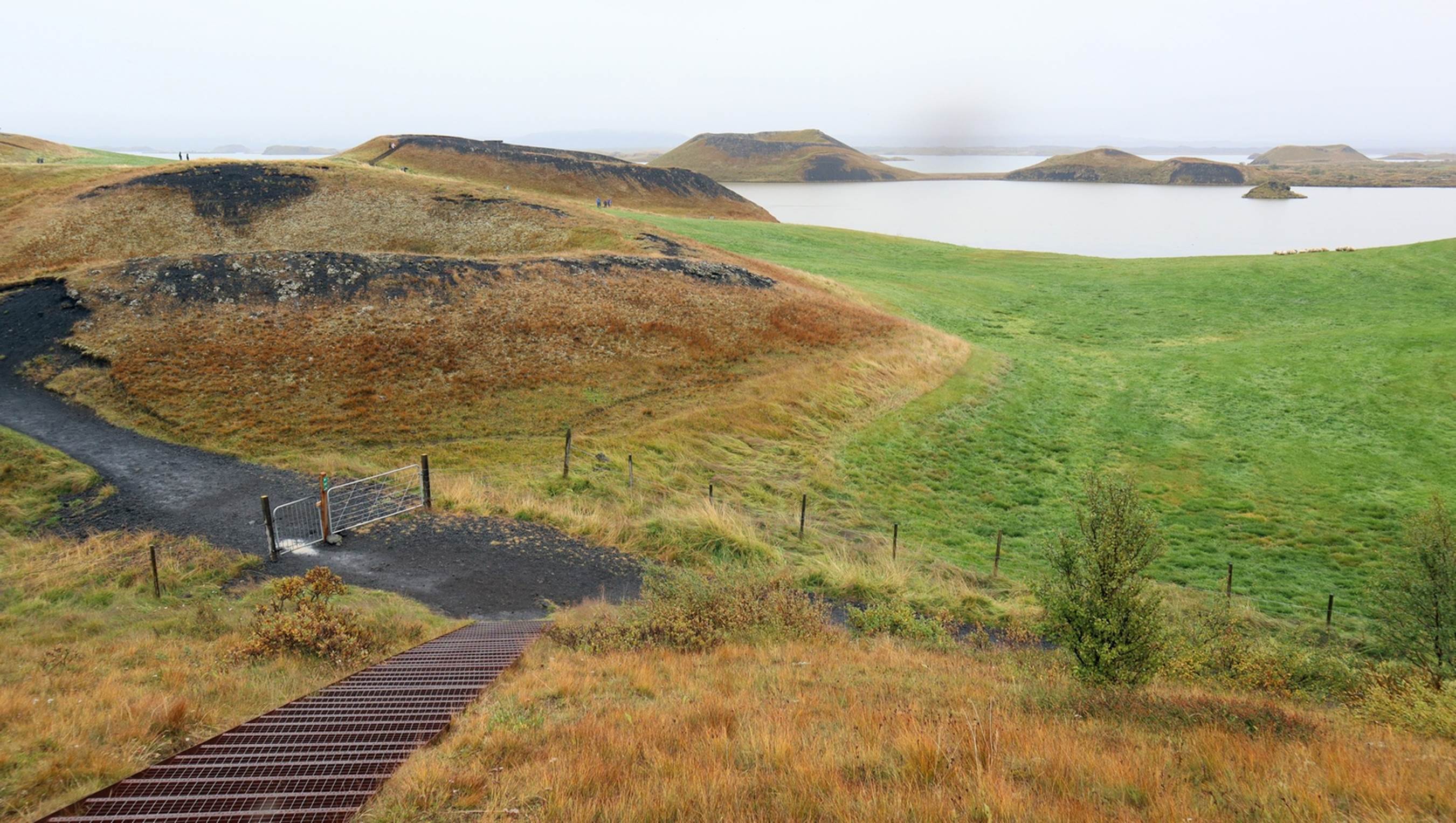 We had some time to look around after the meal and. Although it was raining lightly, we walked across the road to fields and hills that overlooked Lake Myvatn. This lake is known as one of Iceland’s most beautiful lakes, and some photos I saw of it were beautiful, but today it was largely lost in the mist and rain.