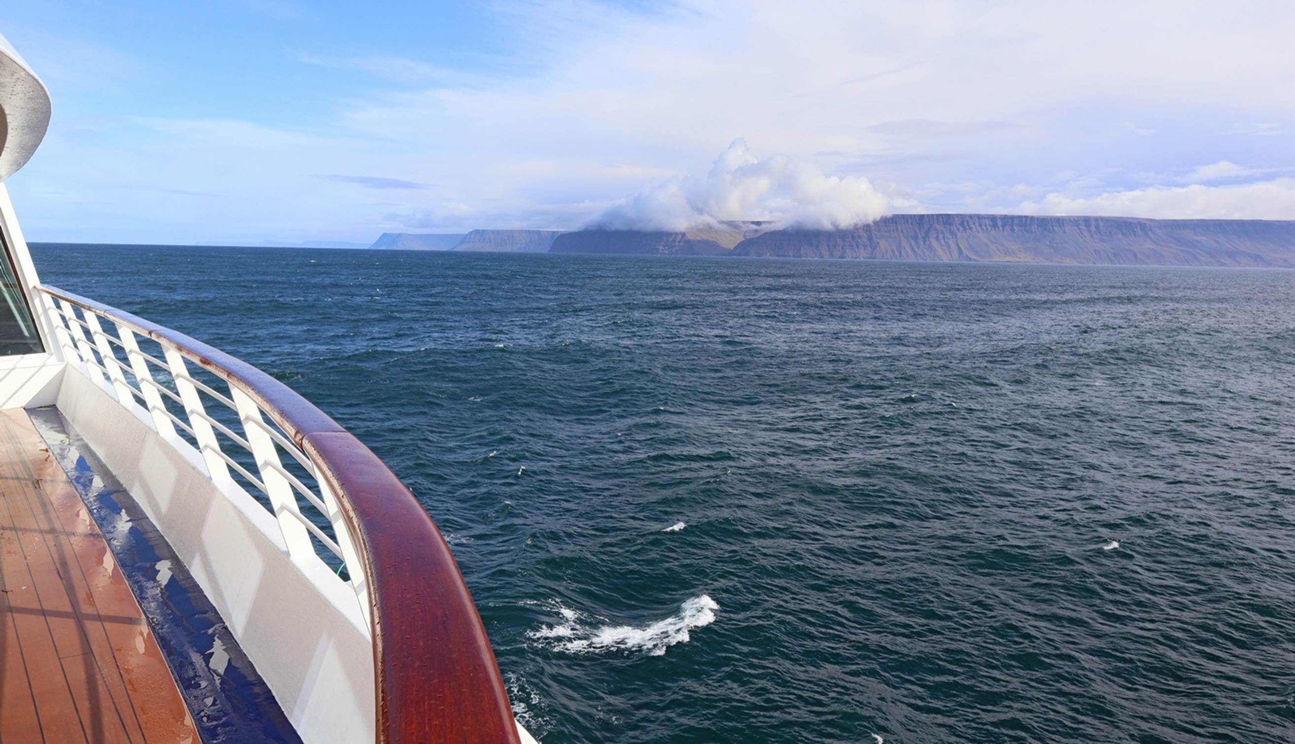 Today would be a day “at sea” as we headed around the northwest corner of Iceland, then down the west coast, back to Reykjavik. For much of the time it was a rather, er… “interesting” ride. For most of the morning we had basically a following sea, so the ship was mainly “pitching” up and down through the waves. The ship was just slightly longer than the distance between the waves, so the ride was reasonably smooth. You can see the swells lined up next to the ship in the photo below.