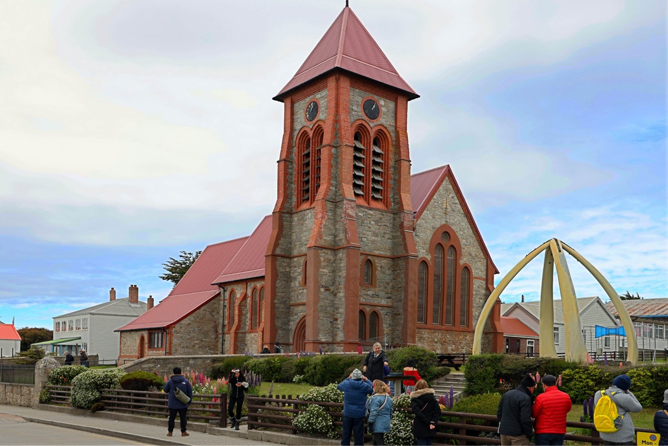 We watched the penguins on the beach for a while and occasionally warmed up in the museum or gift shop until our van returned to pick us up after two hours. When we got back to town Susan and I took a short walk along the main street fronting the harbor. The biggest structure around there was a church with well-groomed landscaping and a whale bone “arch” in the front. The arch was constructed in 1933 to commemorate 100 years of British administration of the islands and is also a reminder of the whaling history of the islands.