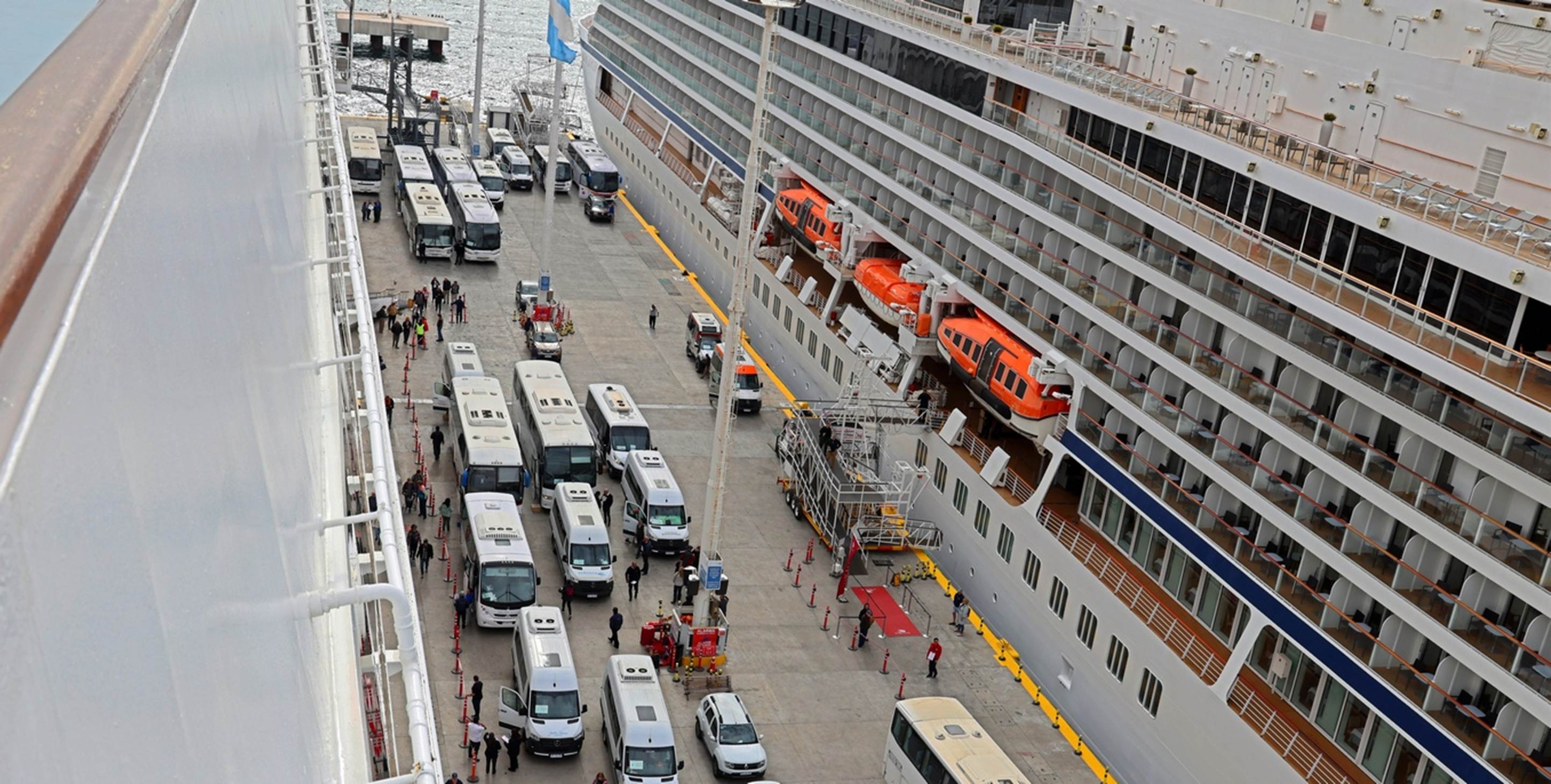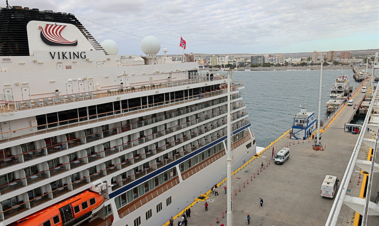 As we got up this morning, the Marina was docking at our last enroute port on this cruise, Puerto Madryn, Argentina. Another cruise ship, a Viking cruise liner, had arrived shortly prior to us and people were already getting off of it as our crew was still making our mooring lines fast.