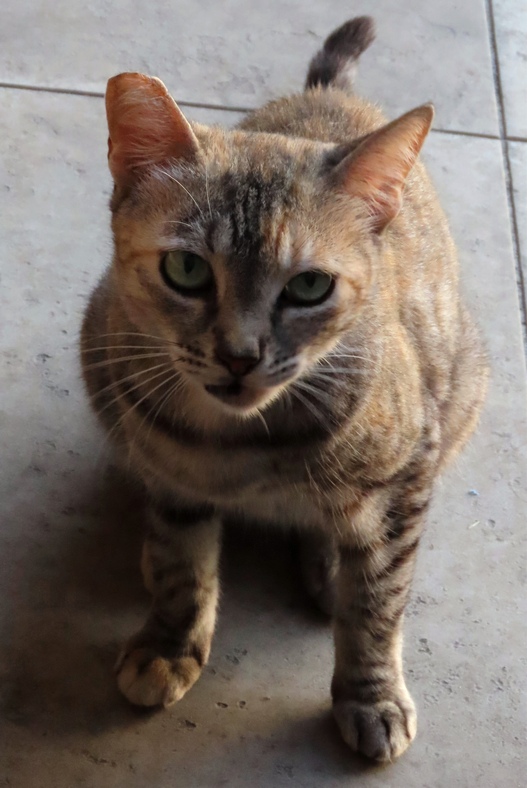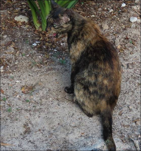 For many years, we have been helping take care of the cats that hang around the village and we have seen at least one of them for the past 4 or 5 years. The one we have known the longest has a “Tortoise Shell” coloring and we call her “Miss Tortie”. She tends to hang around the building where we were this time, probably because some of the GOs in the nearby GO rooms also feed her.