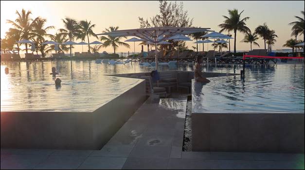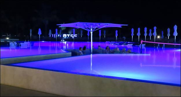 The pool is an infinity type pool, but the top of the pool is actually about two feet above the surrounding pool deck. There is a narrow catch basin all around pool to catch the overflow. Along a couple of the sides of the pool is a ledge, about 4 feet wide and 4 inches deep where there are some low-slung lounges. You could lay on these lounges and have part of your body immersed in the water. The pool was set up to accept a trapeze apparatus and one of the evening shows made use of this. There were two problems with the pool though: 1) it war relatively deep throughout the pool, making it difficult for some people to do the water aerobics and 2) getting out of the pool is rather awkard.