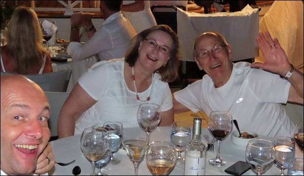 As has been our custom lately, on our last night we got a table on the deck and a couple of bottles of good wine and had the sailing team join us. It was Coco’s day off so she did not join us (I cannot blame her) but the rest of us had a very pleasant dinner telling sailing and GO/GM stories.