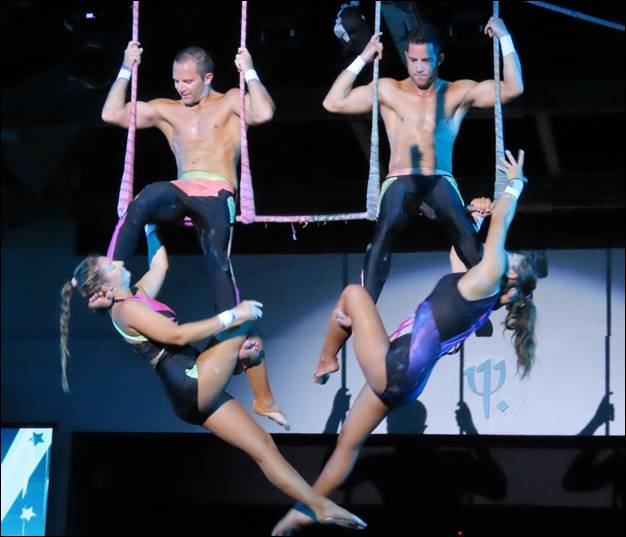 On “white night”, when there were many tables set up around the pool deck, the show was largely on the trapeze apparatus set up over the pool. Here is a video of one of the nicer routines over the pool that evening.