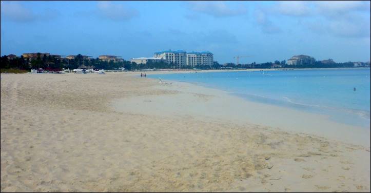 Looking Southwest from Club Med along Grace Bay Beach: the larger buildings are the Seven Stars.