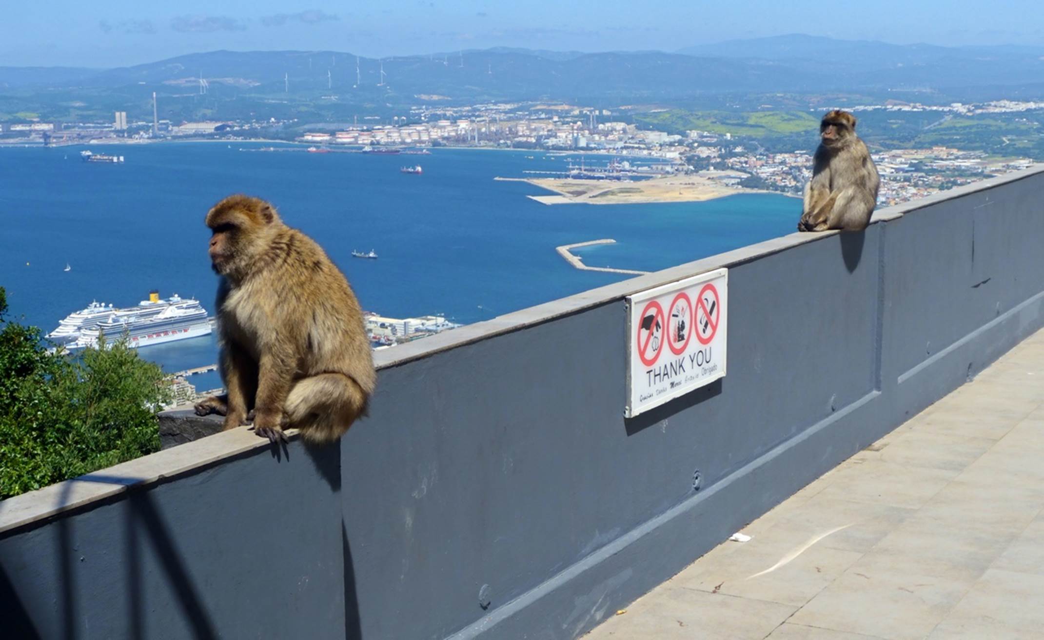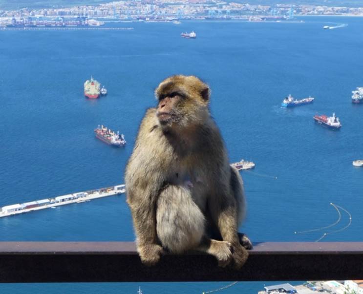 When we got to the top and got off the cable car, there were no real signs saying what you were supposed to do or where to go, so we did the logical thing and just followed our adopted guide. Of course, there were the famous Gibraltar monkeys waiting for handouts (or “take-aways”) from the tourists. (Technically, they are Barbary macaques, but everyone just calls them “monkeys”.)