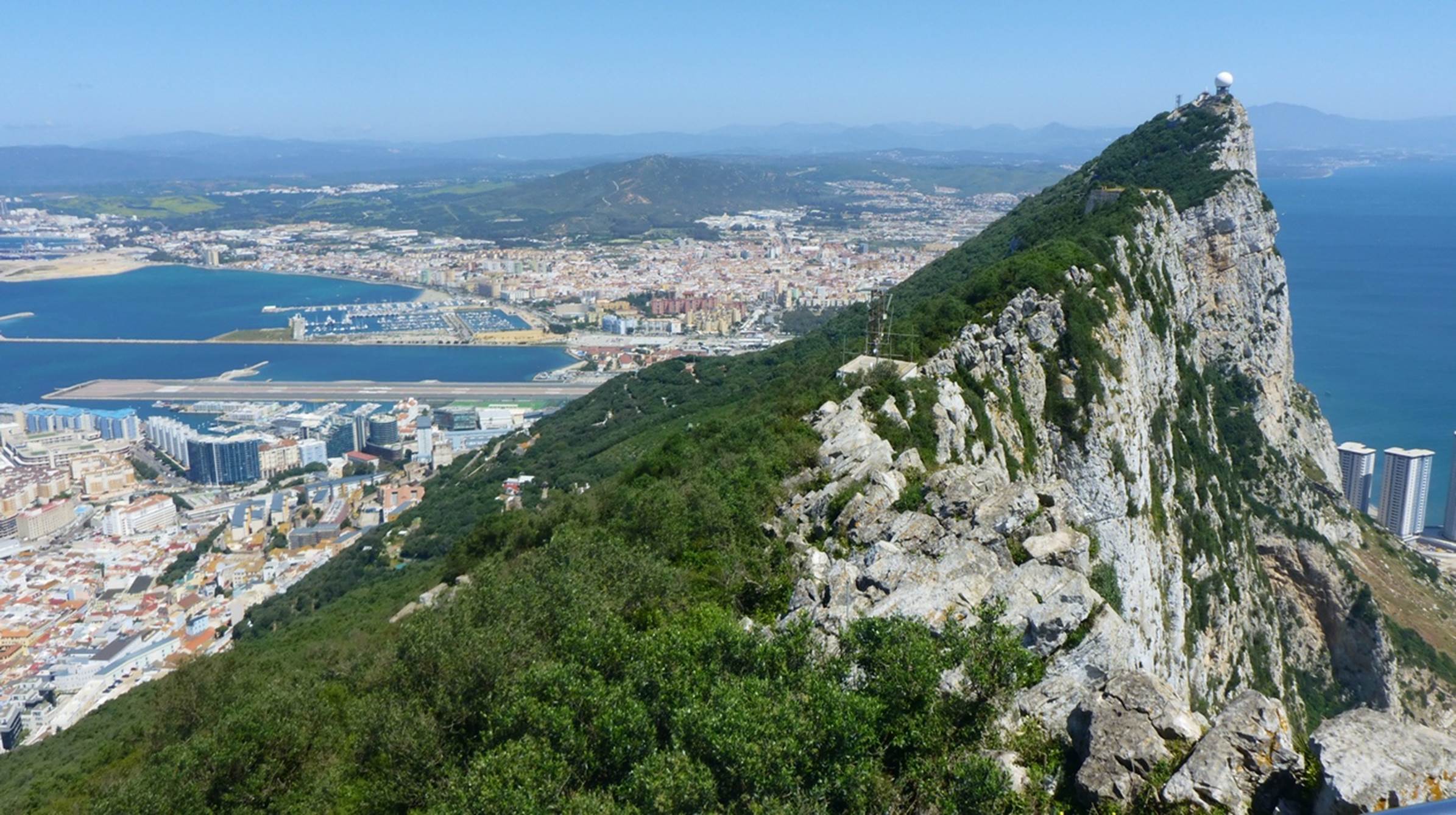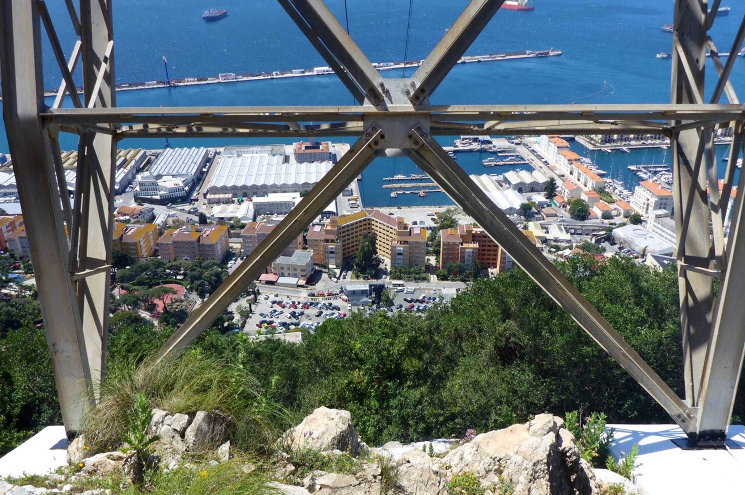 The guide led the tour group, and us, to an observation platform at The Top of the Rock and there was quite a view. Make sure you check just how high we are in the photos just above and below: it will be significant in a little while. The Top of the Rock is 1386 feet high while the peak just north of there, Rock Gun, is 1380 feet. From where we were, we could look past the Rock Gun, past the airport runway, and well into Spain. From our previous visit, when we arrived via land, I knew the Spanish border was just a little beyond the runway.