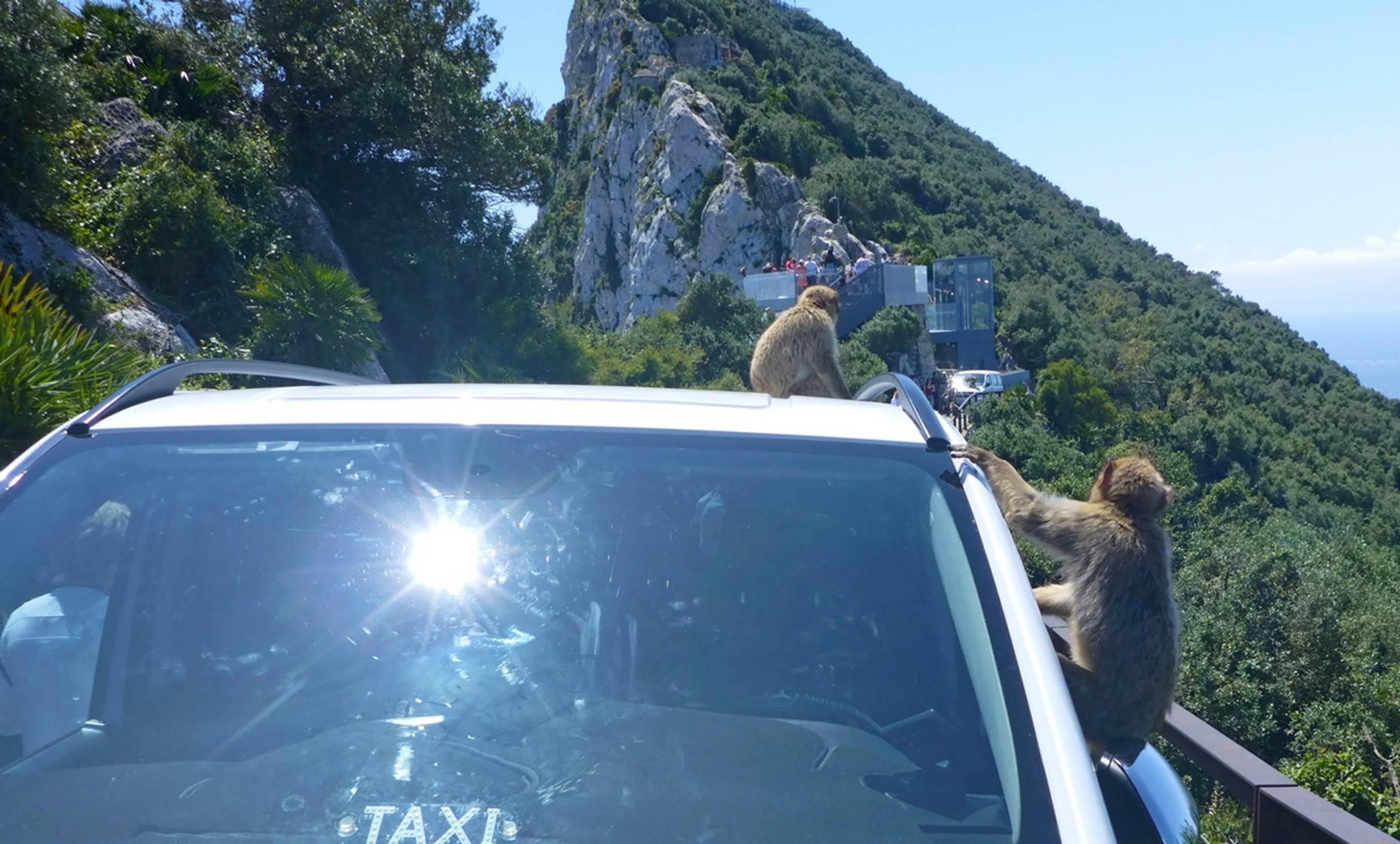 There was a pretty good/steep downhill road from the top down to the next major attraction, St Michael’s cave, and the monkey’s provided continuous entertainment. The local people, like the taxi drivers, did not like the monkeys because they will grab and take about anything loose that they think might be something to eat or drink. A few seconds after I took the photo below, the monkey on the side of the car jumped inside the car, grabbed a carton of water or juice, ran out the back of the car and up the embankment on the other side of the road, with the taxi driver yelling at him the whole time.