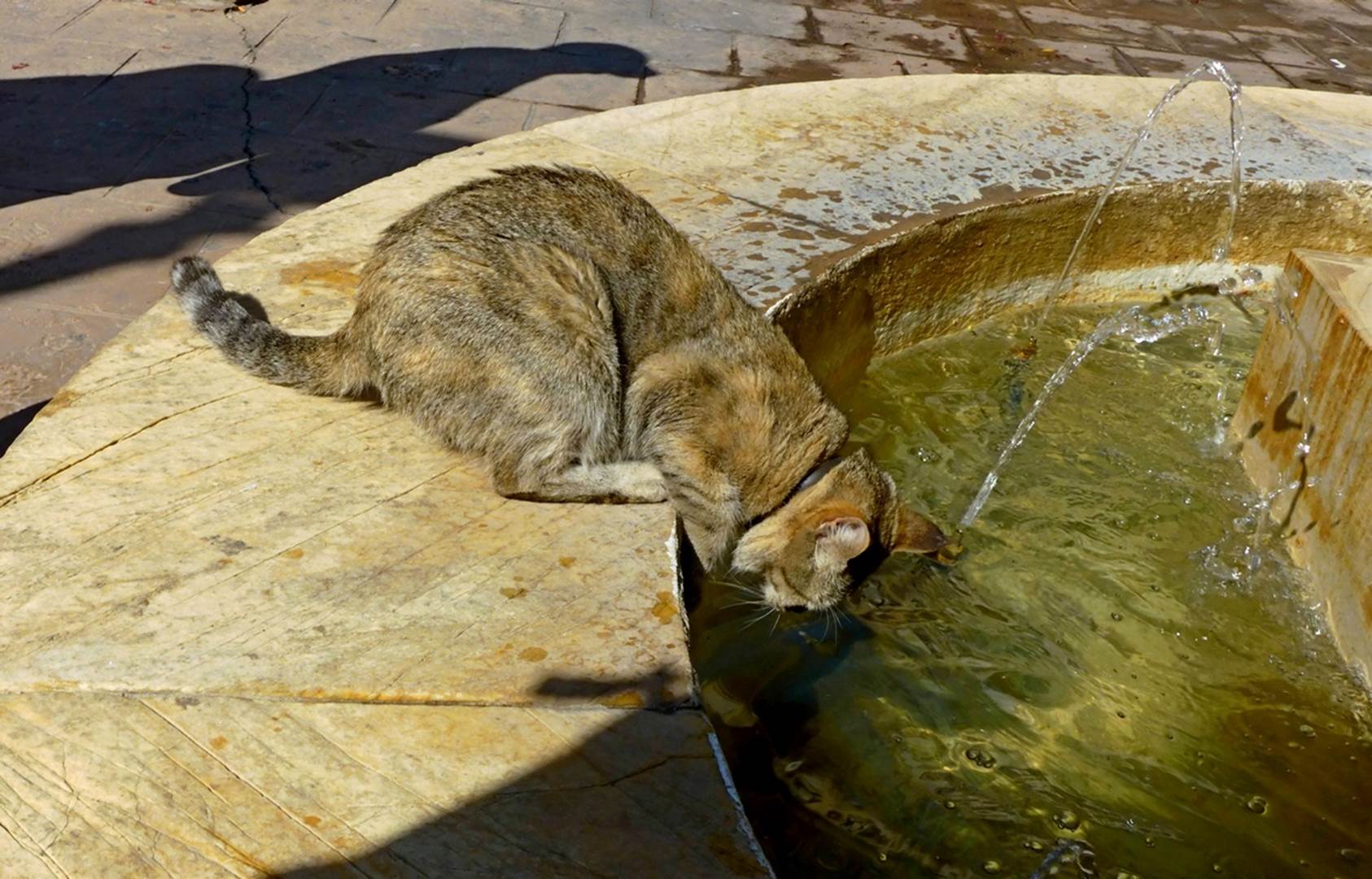 We continued our walking tour, gradually working our way uphill toward the palace. About an hour after we had gotten off the bus, we got to the base of the palace (although it looked more like a fortress to me) and took a short rest break in a small plaza across the street. There were two interesting things at the small fountain in the plaza: a cat and a larger than life-size statue. The cat apparently was very used to doing this as he did not seem at all bothered by the people and commotion around him.